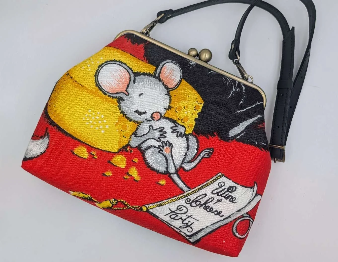 Handmade extra large handbag from vintage linen featuring a cat and mouse having a wine and cheese party