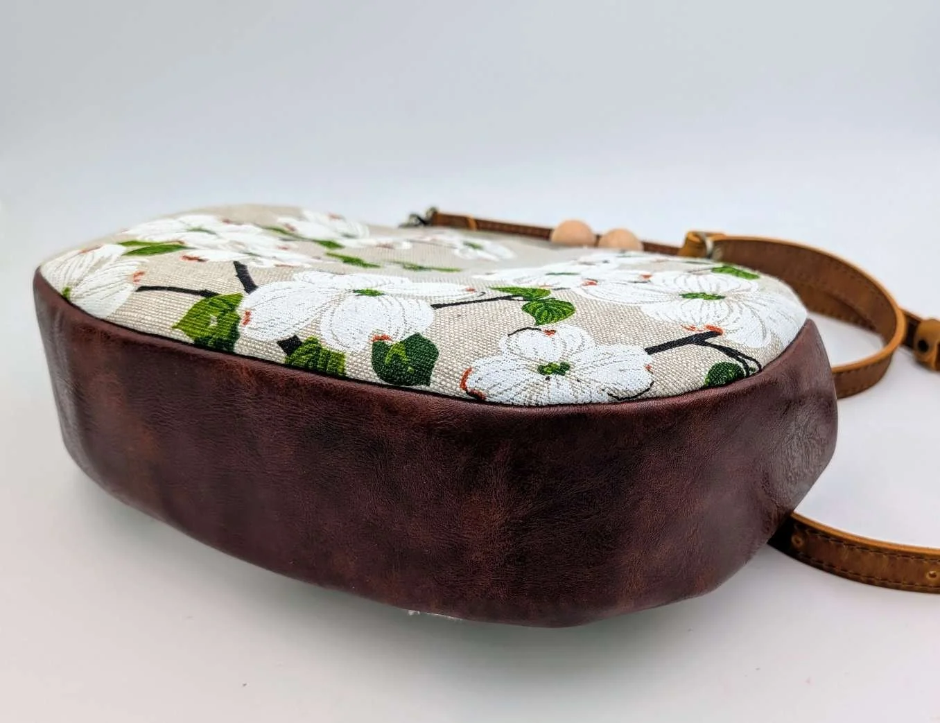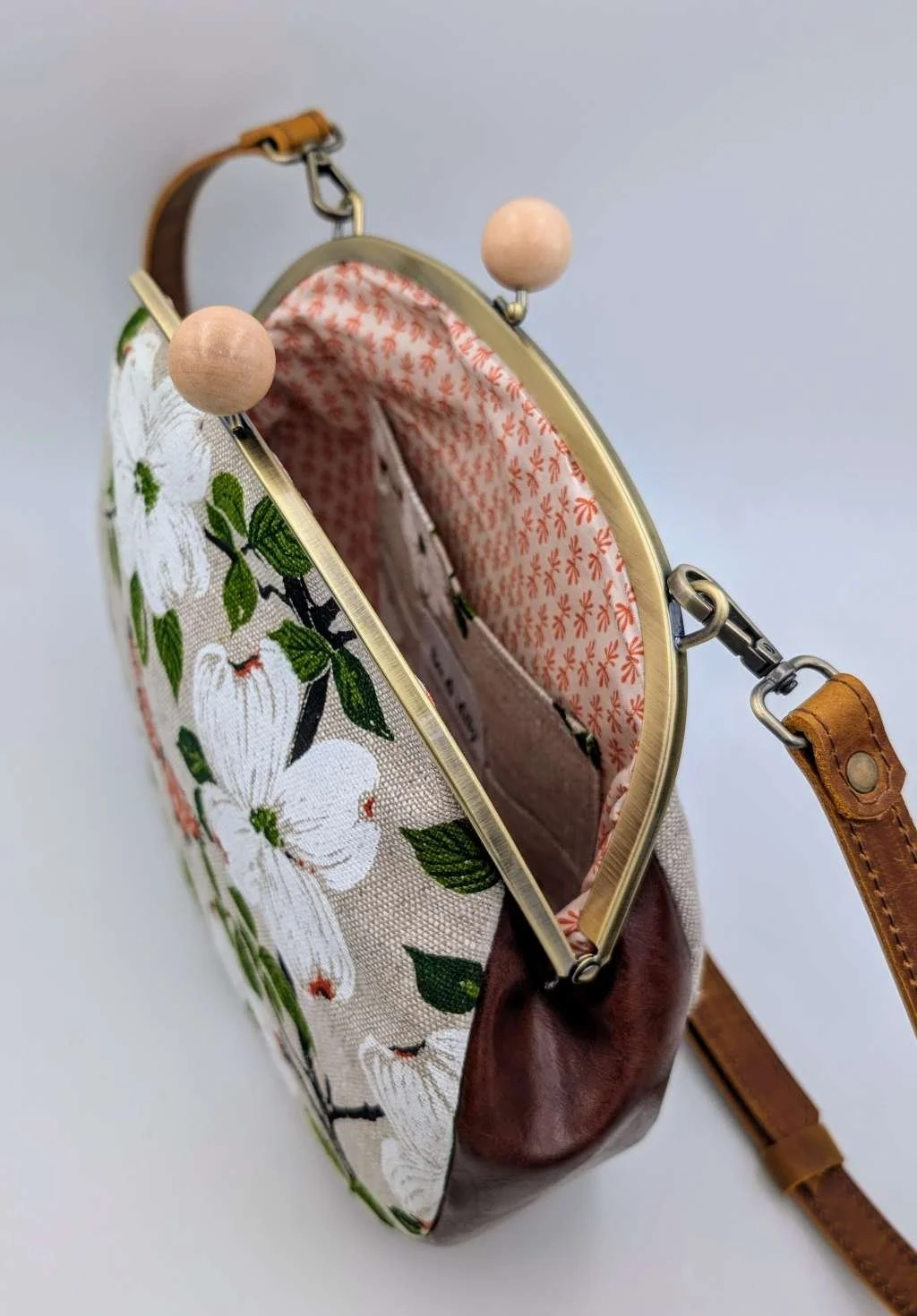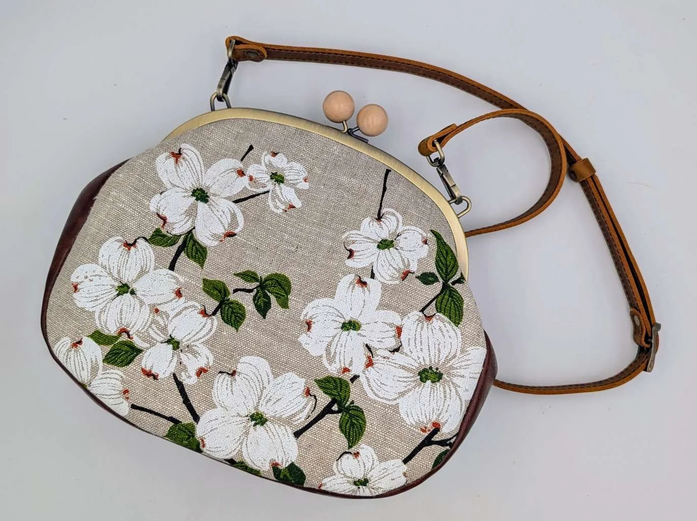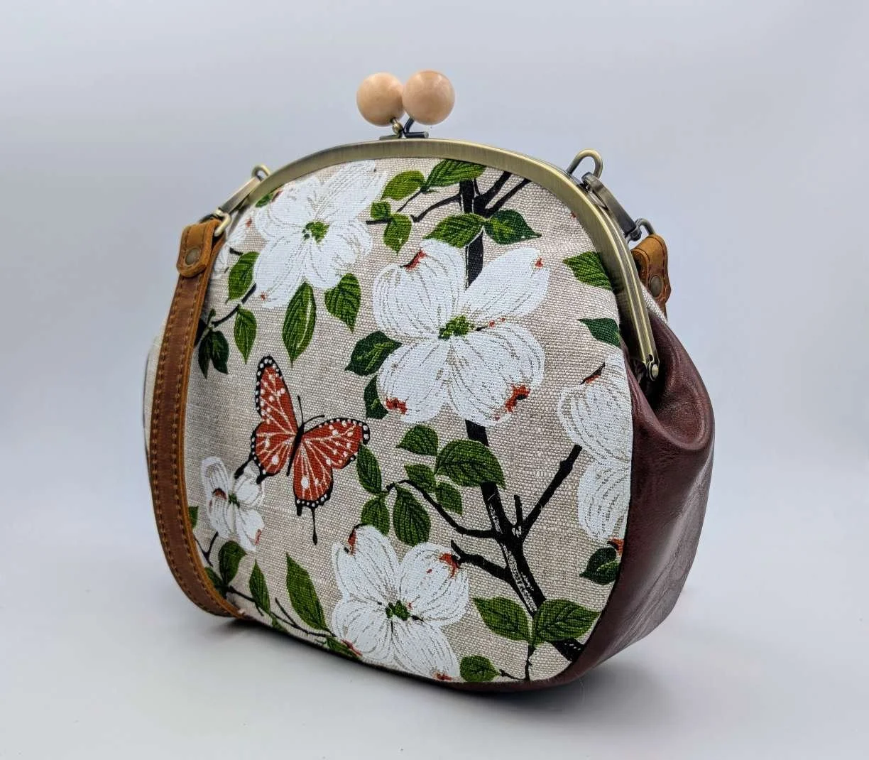 Finished with a kisslock frame with wooden bobbles and has a brown 105cm adjustable leather strap