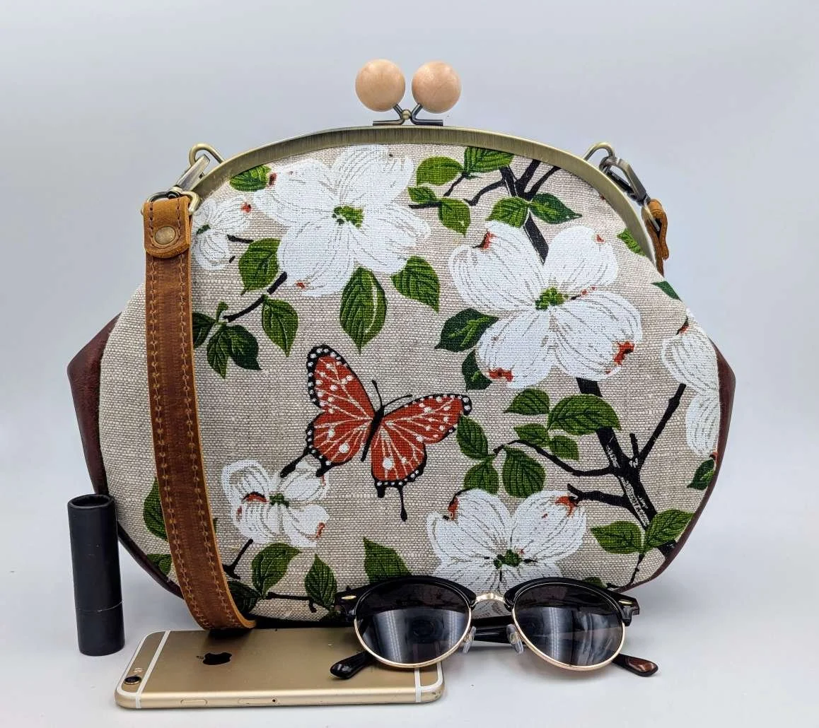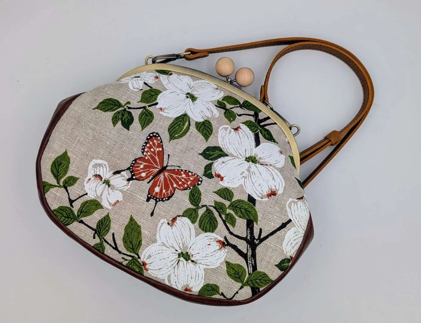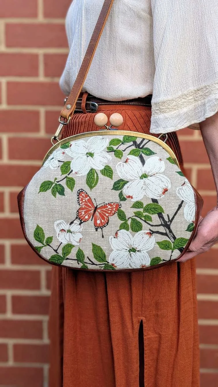 Handmade one of a kind shoulder bag from vintage linen featuring lovely dogwood flowers and a butterfly