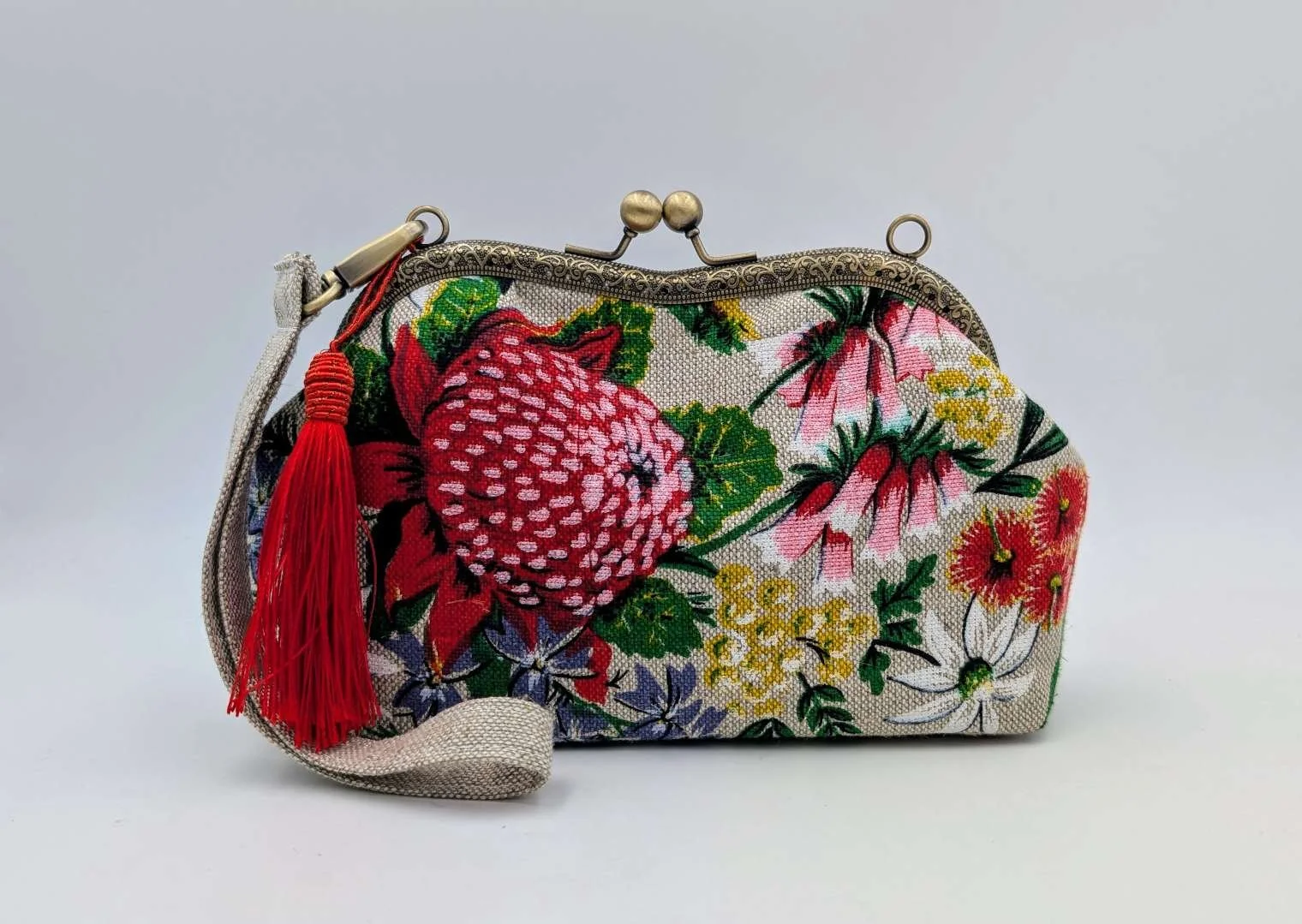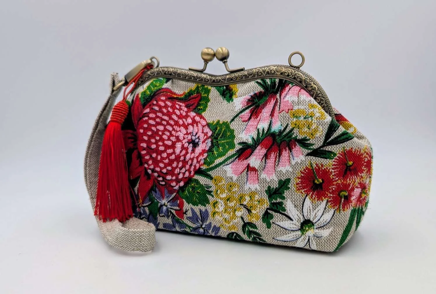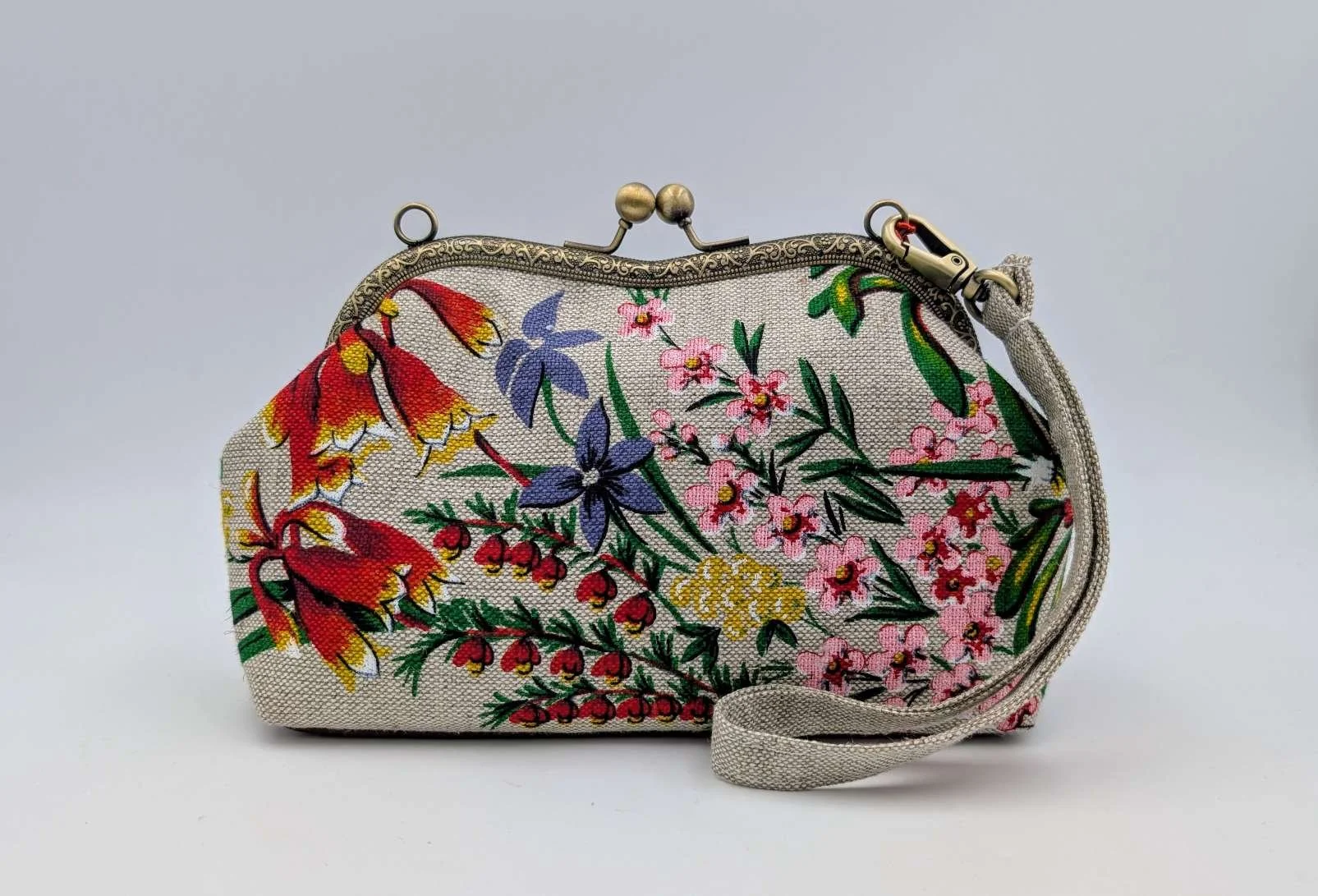 Handmade clutch purse from vintage Australian wildflower linen with a bronze metal kisslock frame