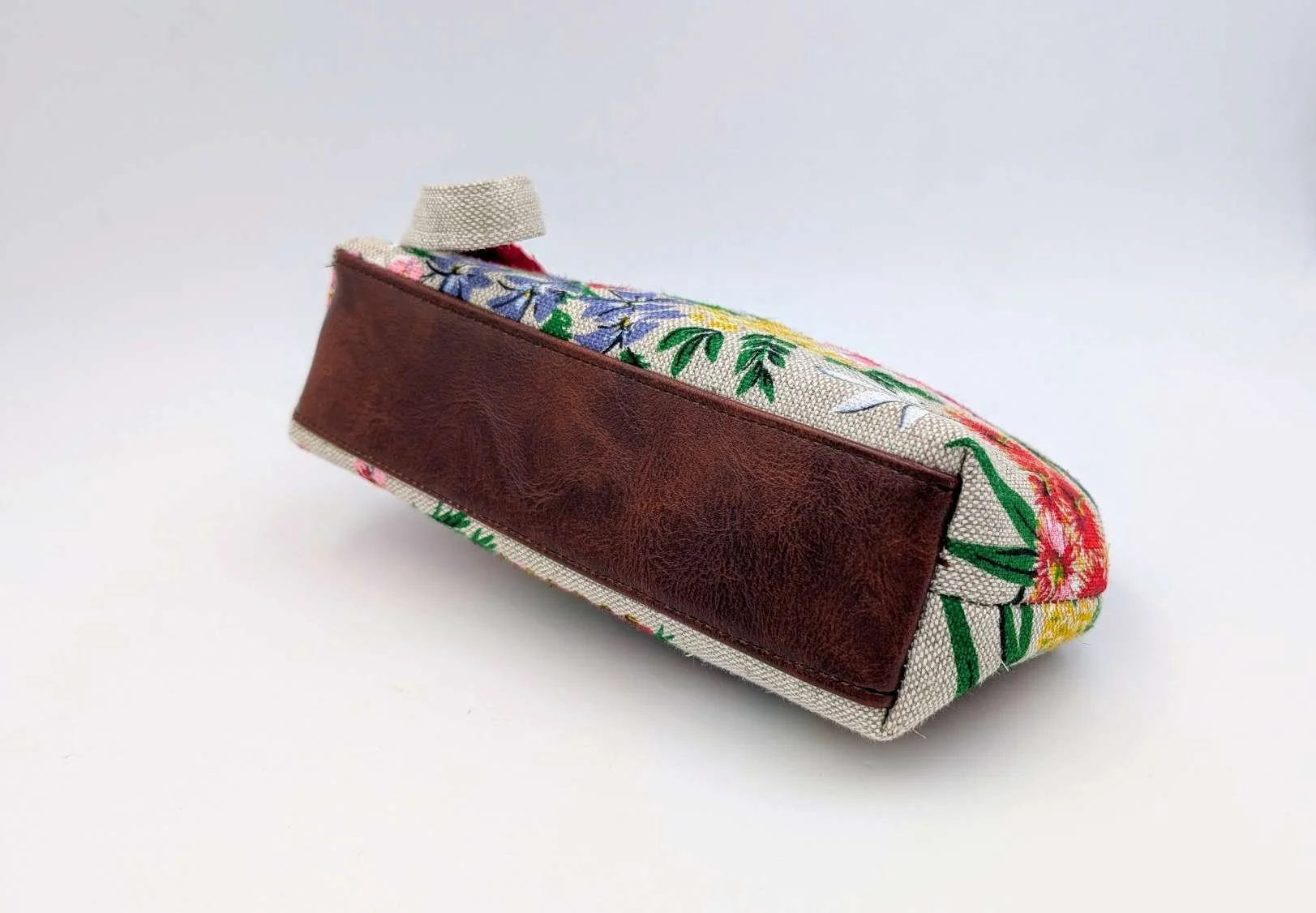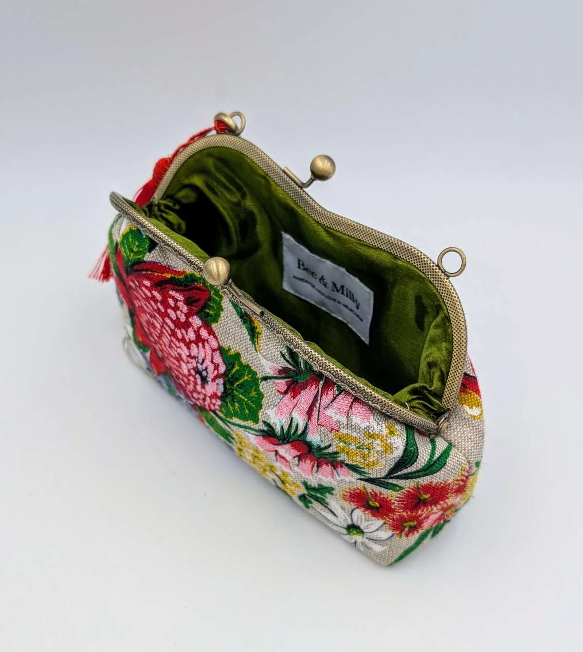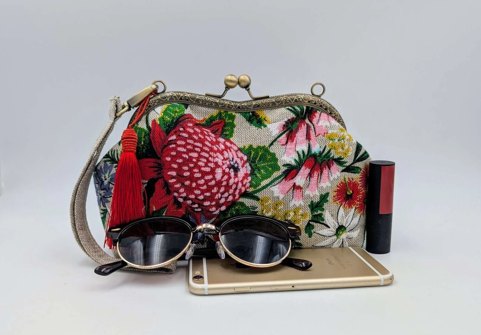 Handmade clutch purse from vintage Australian wildflower linen with a bronze metal kisslock frame