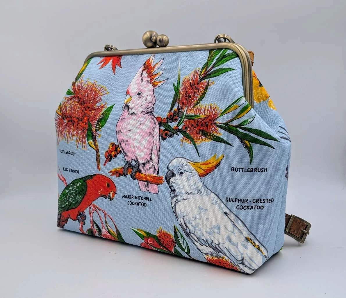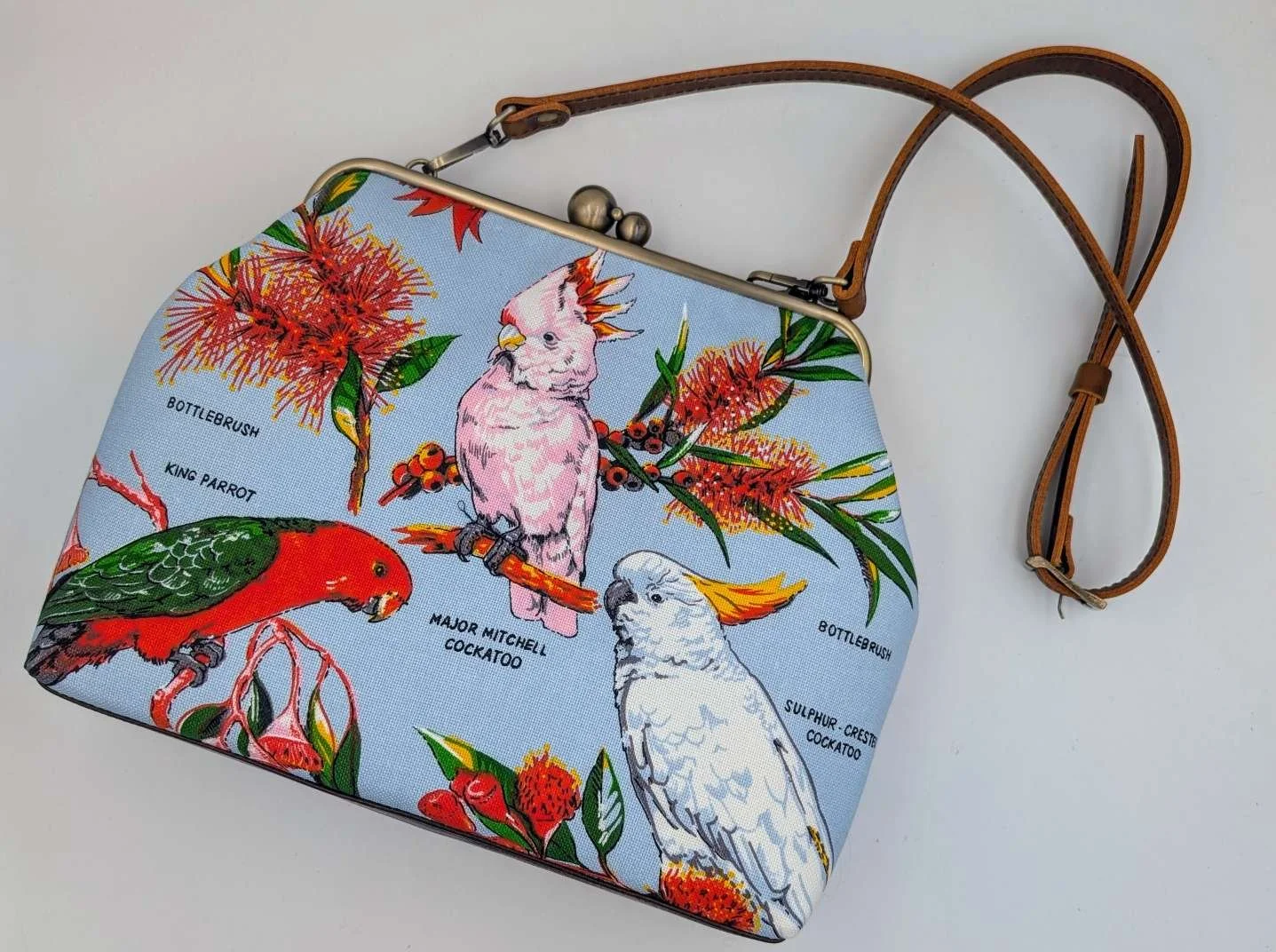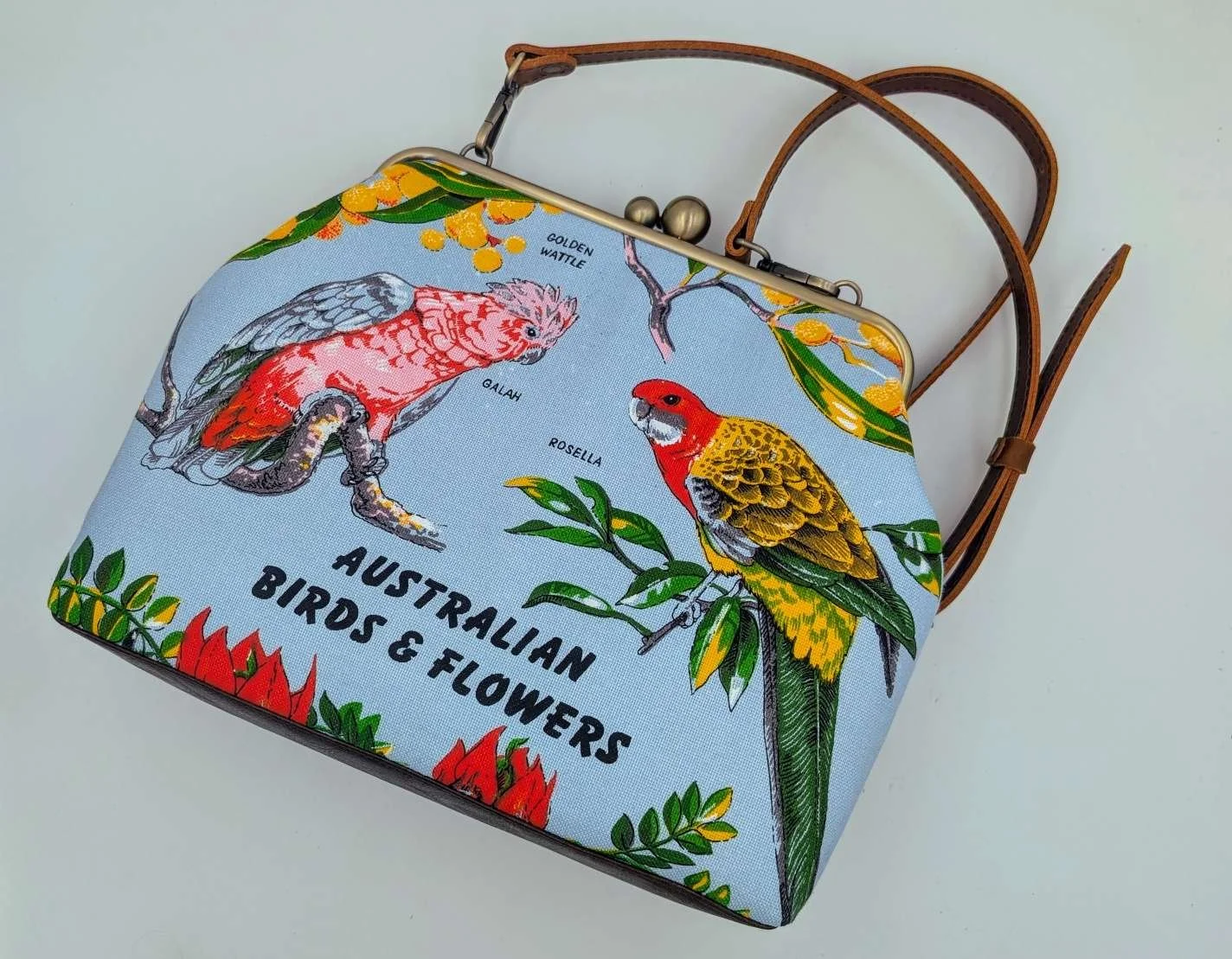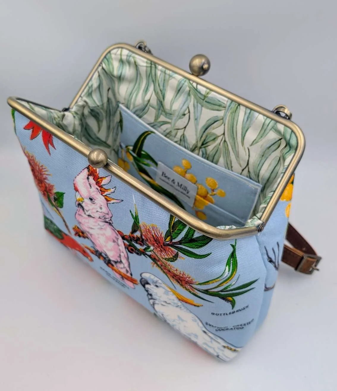 Lined with gumleaf patterned cotton fabric and has a matching inside pocket