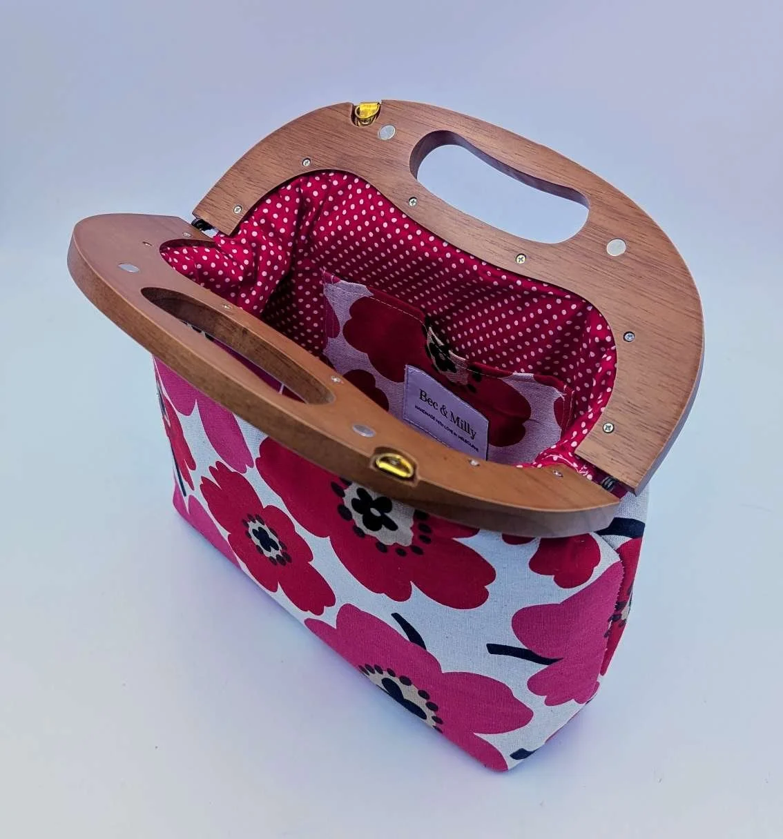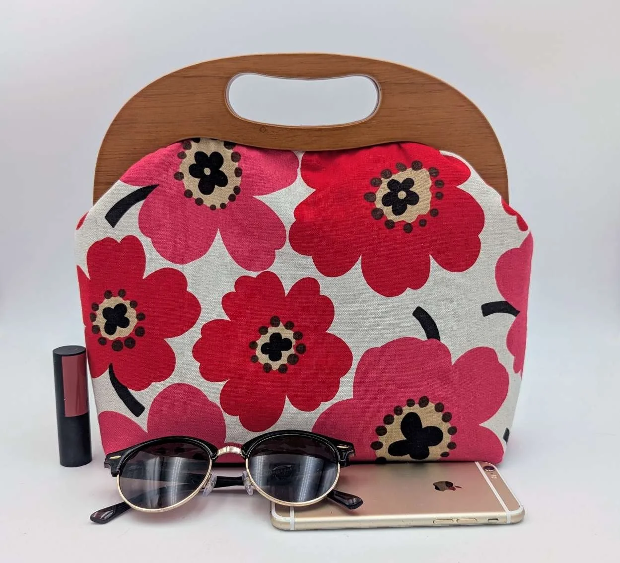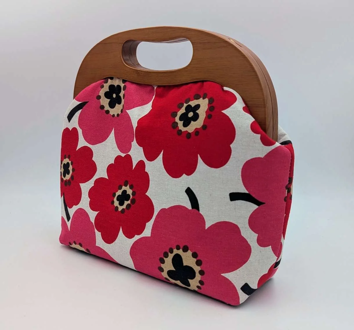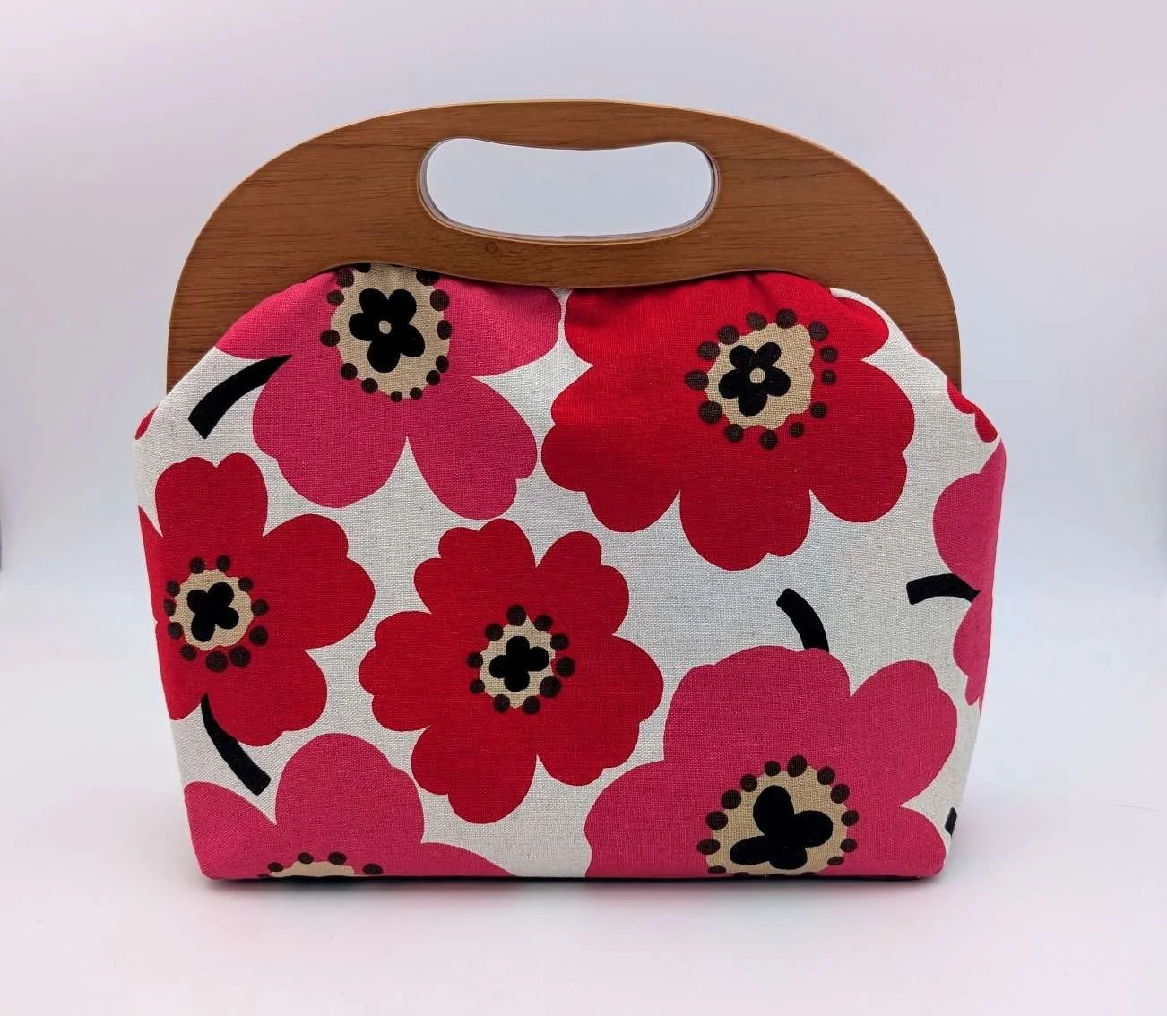 Handmade handbag from Japanese canvas fabric featuring large red and pink scattered flowers