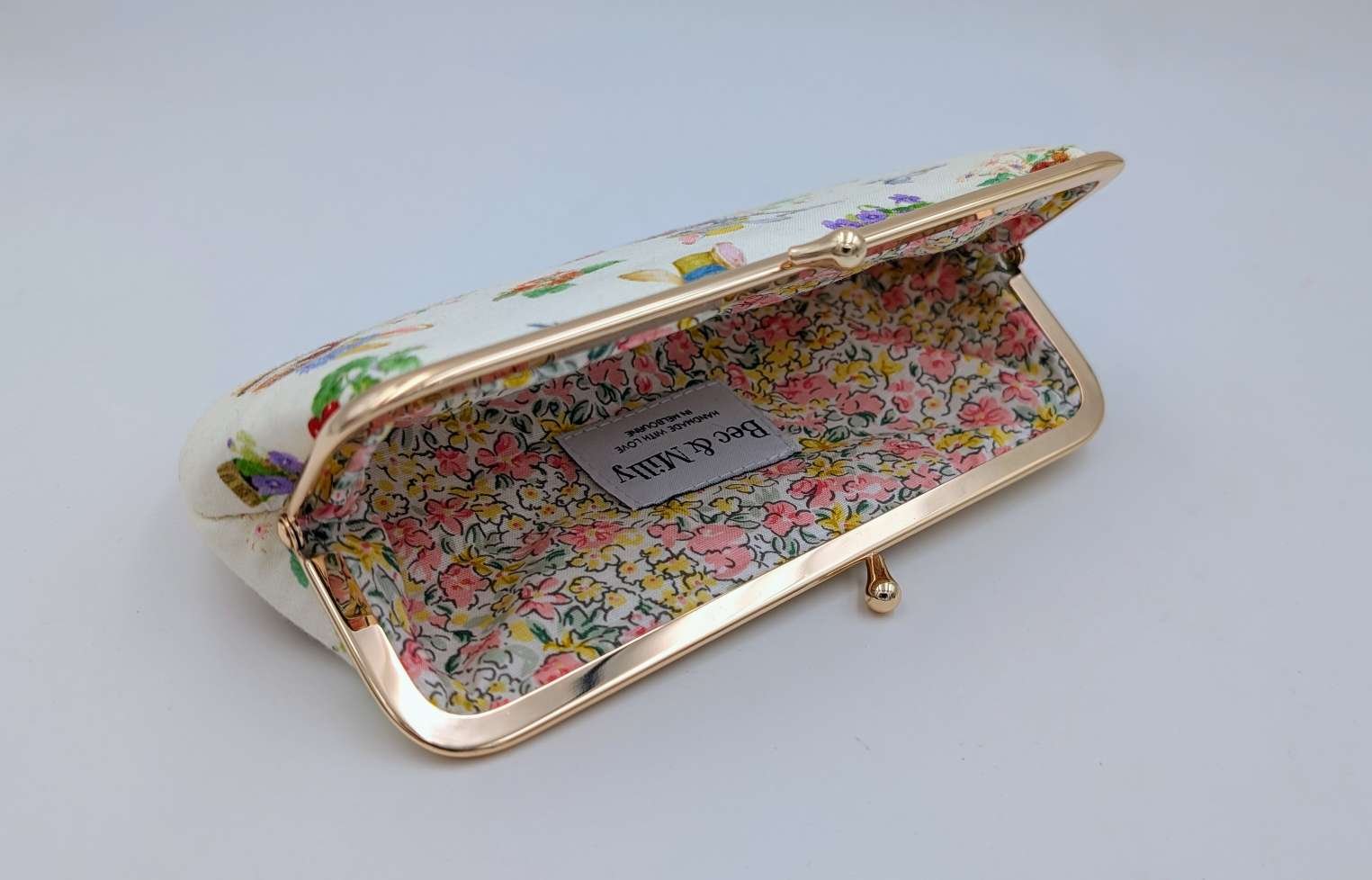 Every purse is handmade in my home in Melbourne by me. Each contains carefully selected vintage, up-cycled and new and unique fabrics. I'm extremely proud of every piece and hope you enjoy taking them out as much as I enjoyed making them :)