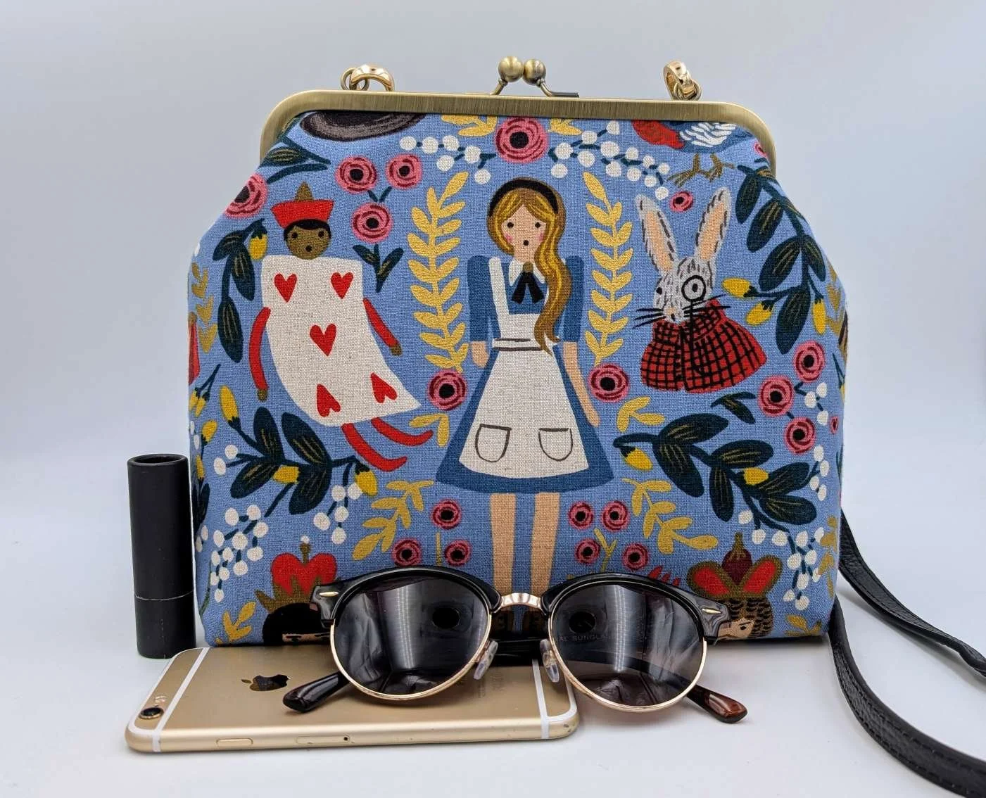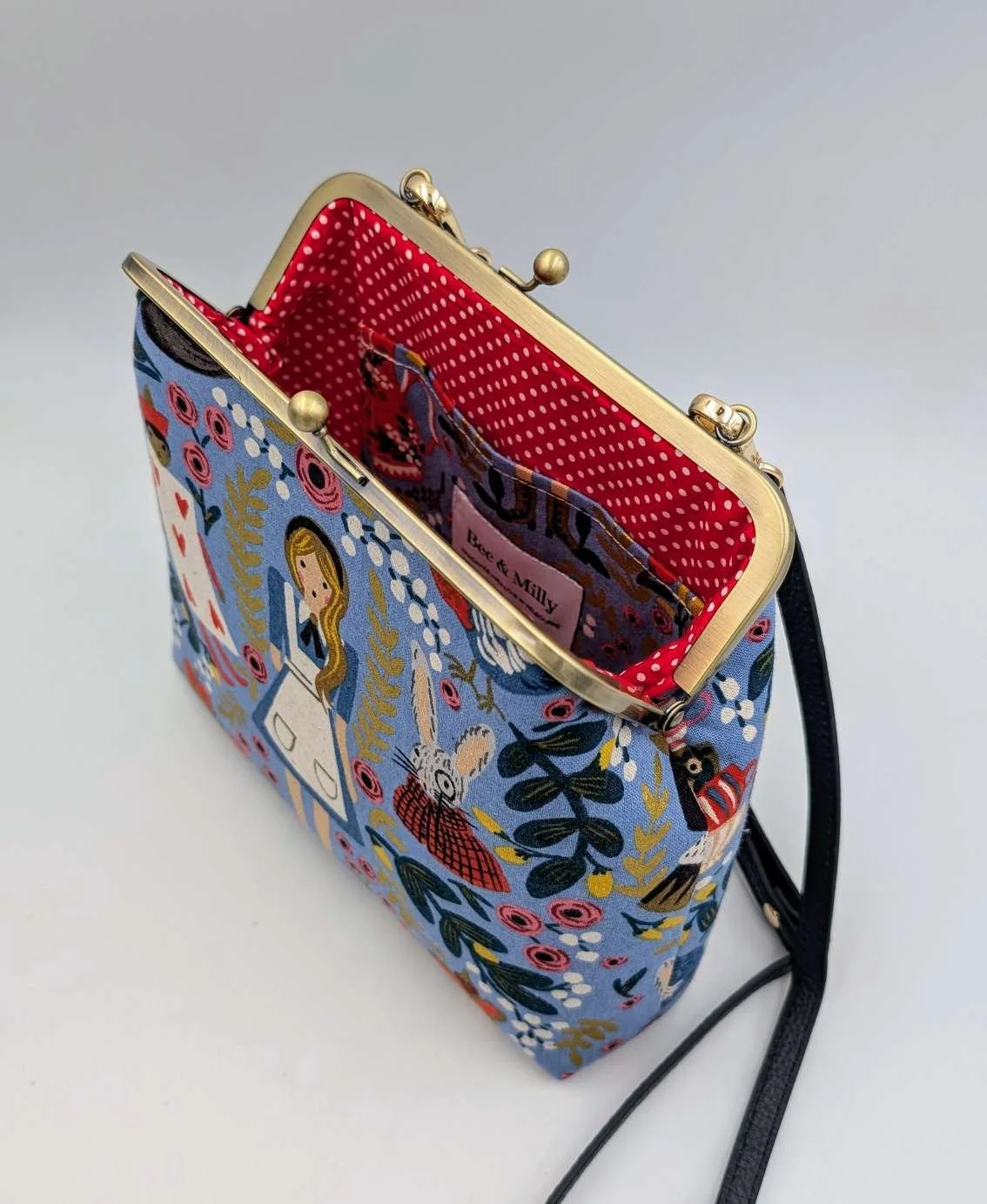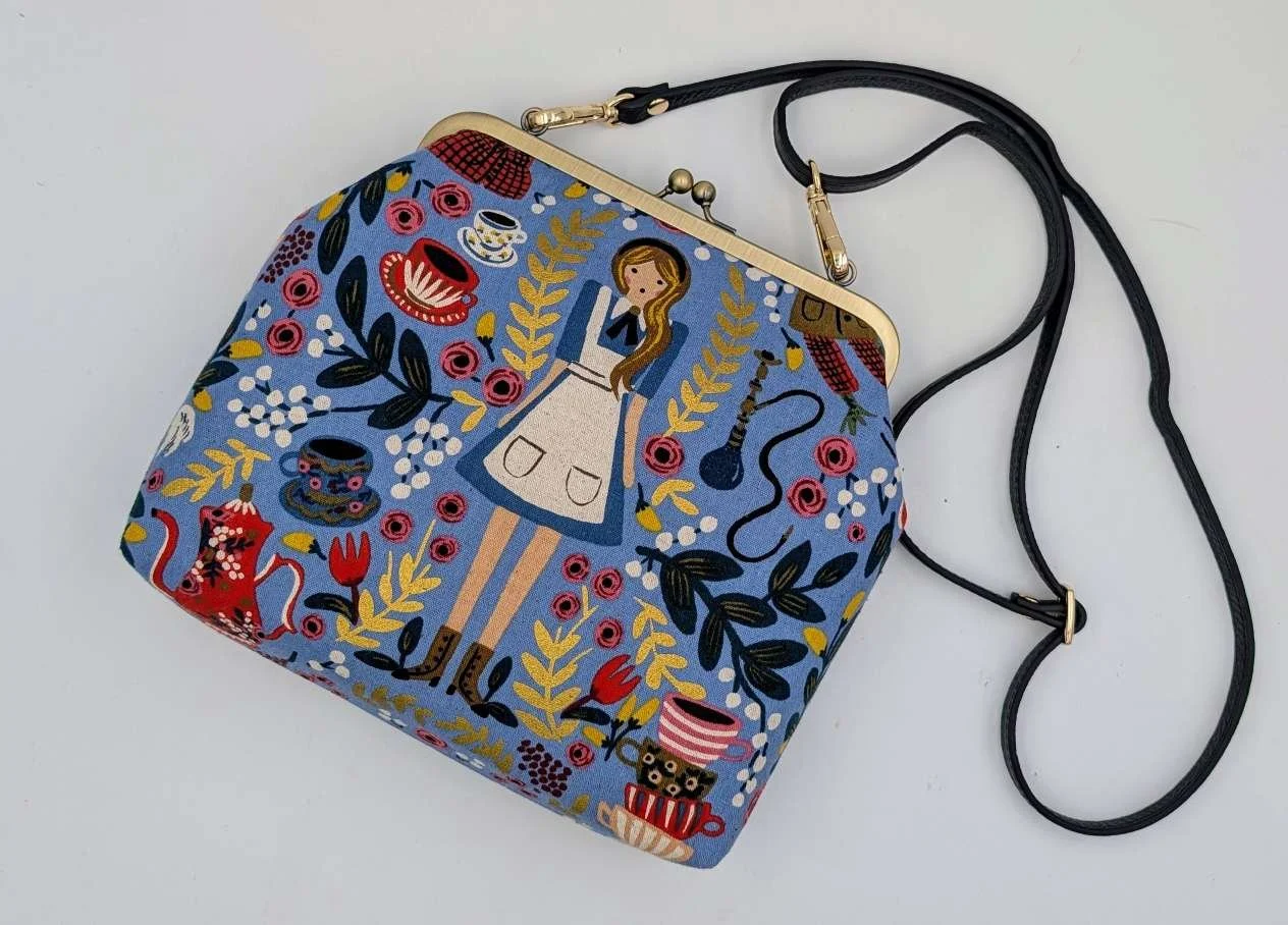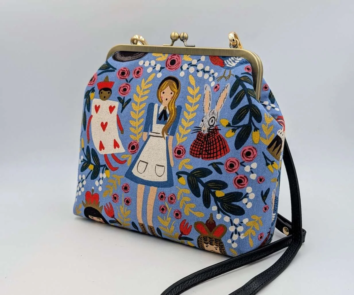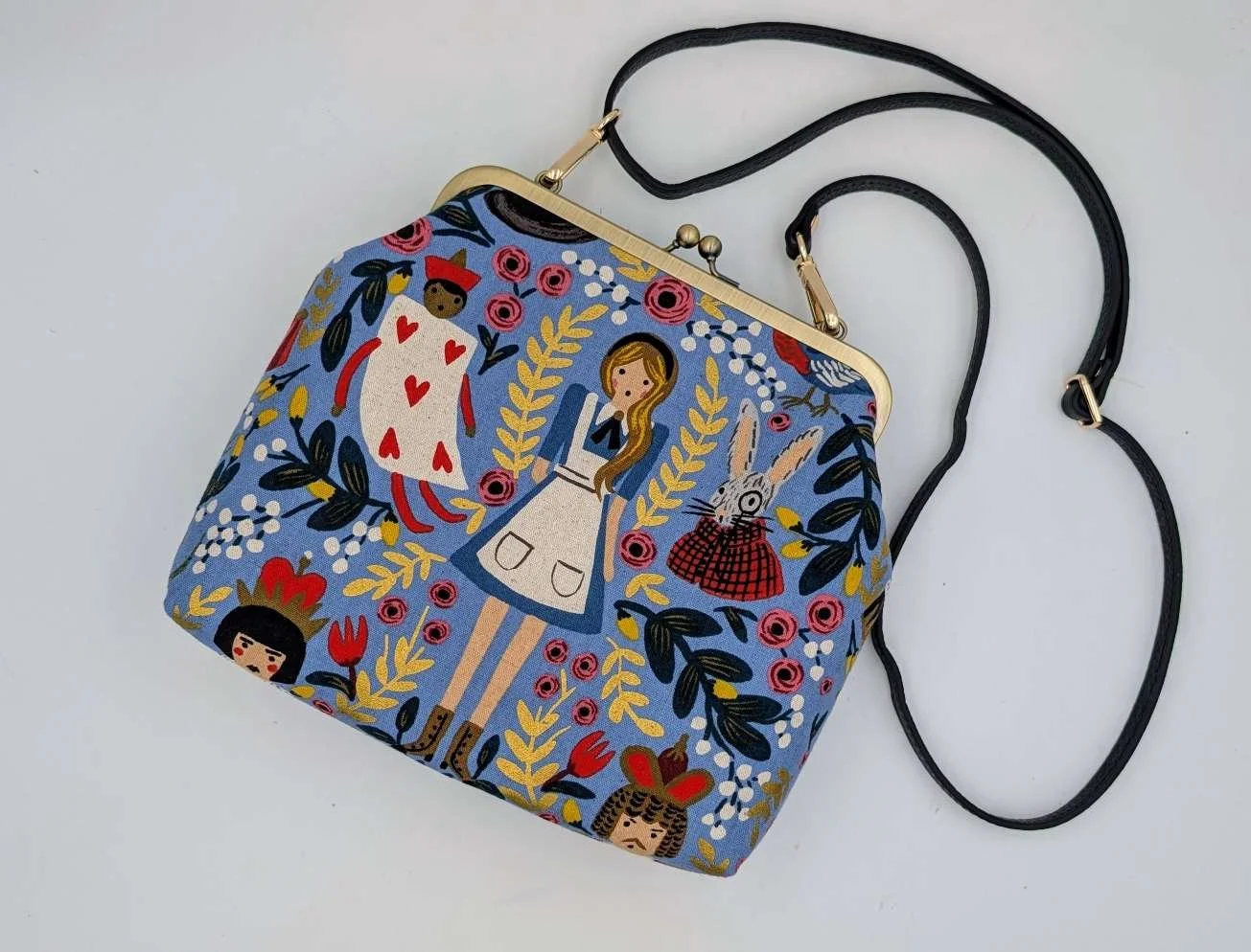 Handmade handbag from Alice in Wonderland on light blue canvas fabric