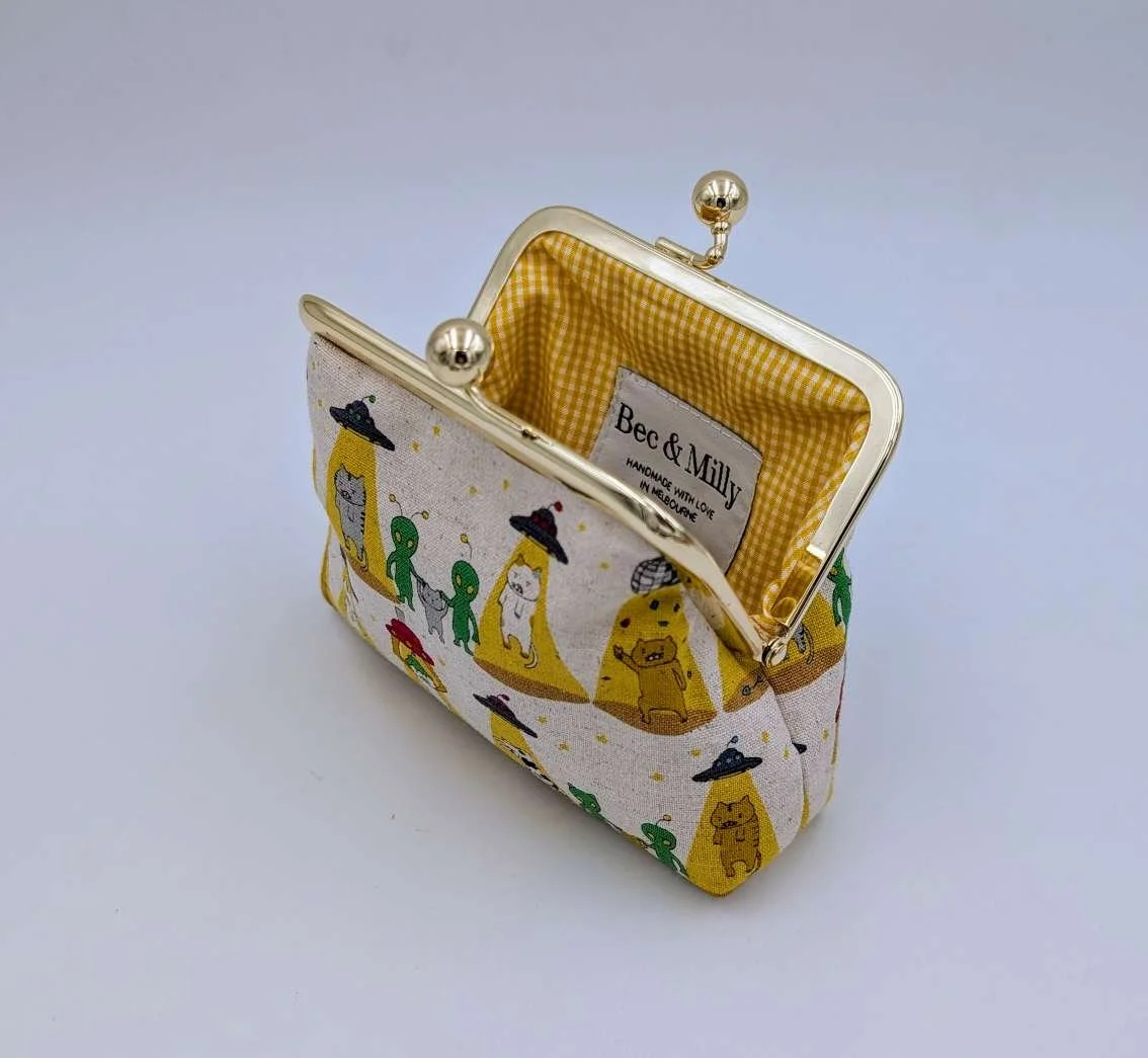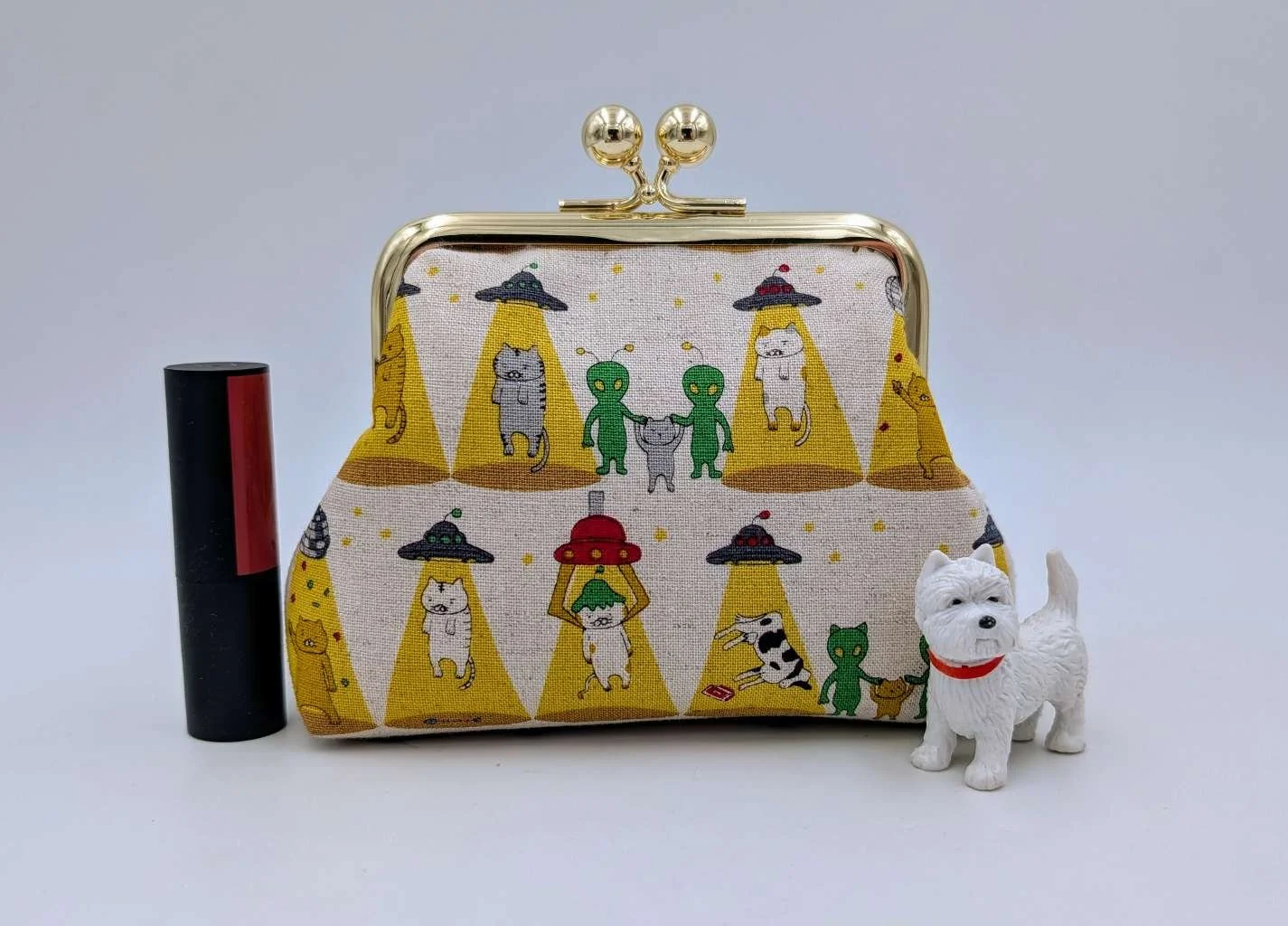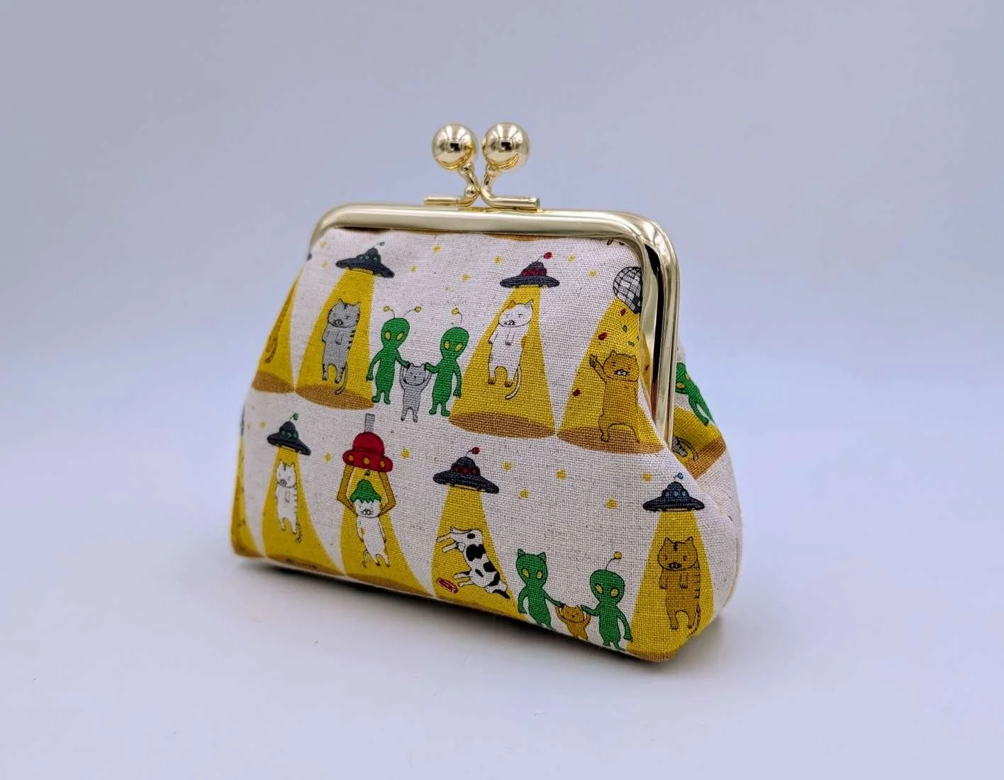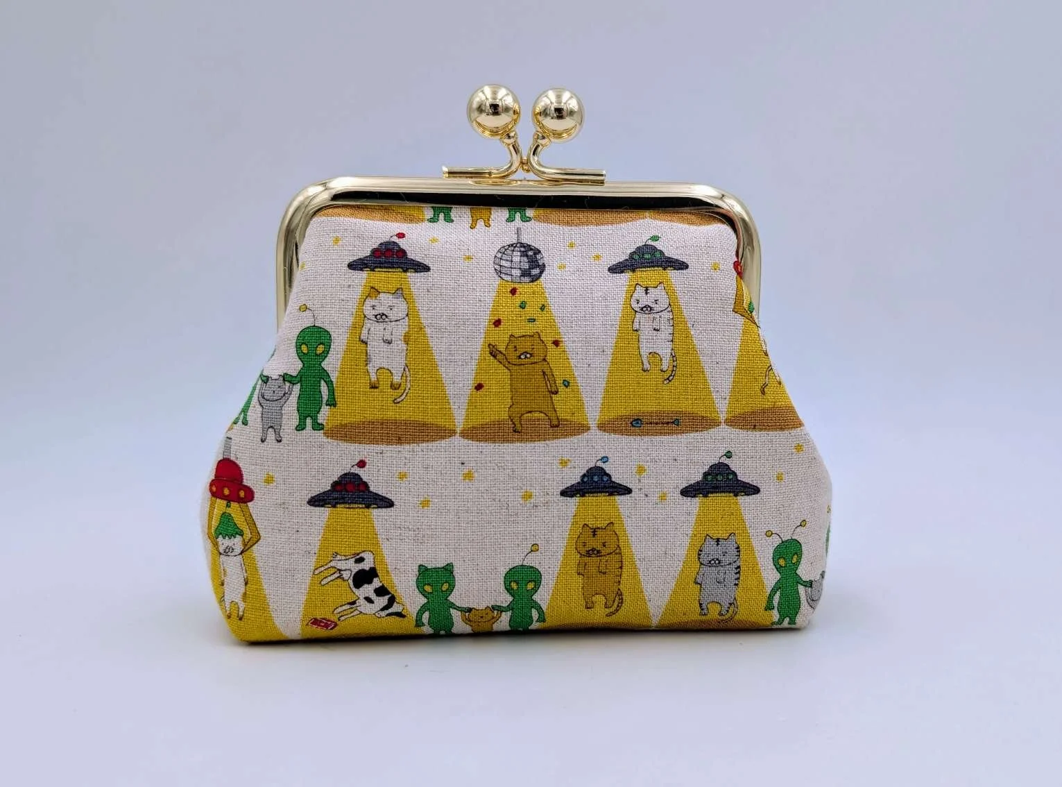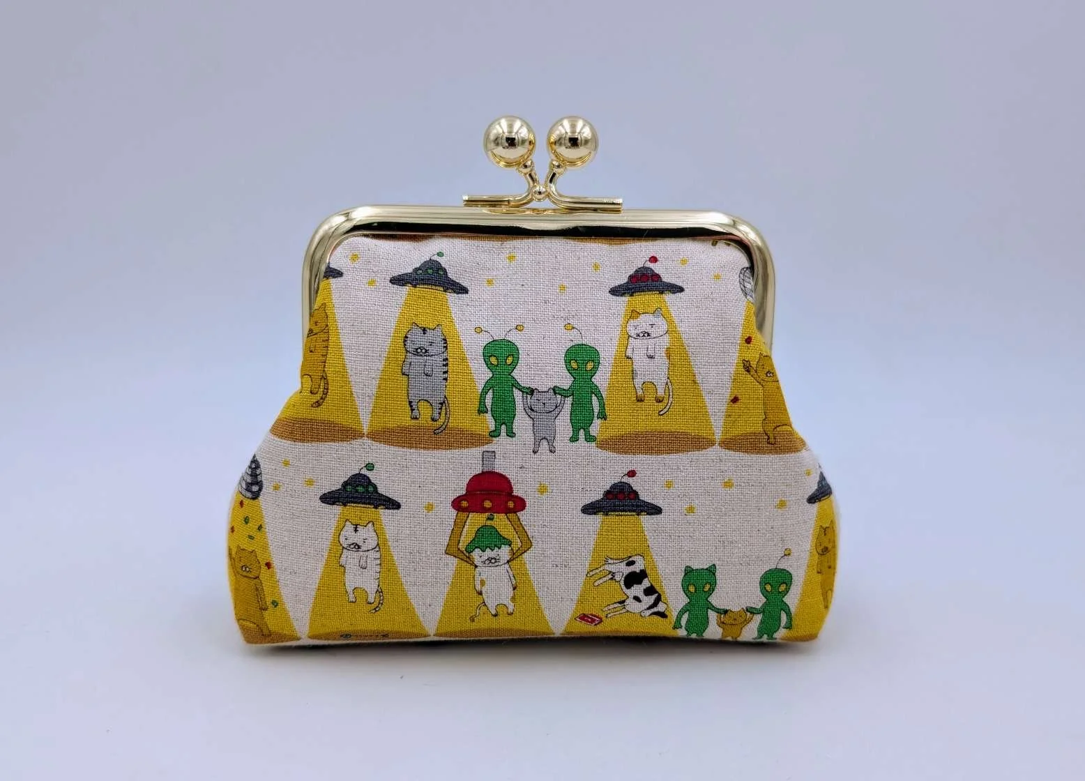 Handmade sweet little purse from Japanese fabric featuring aliens abducting cats (and cows!)