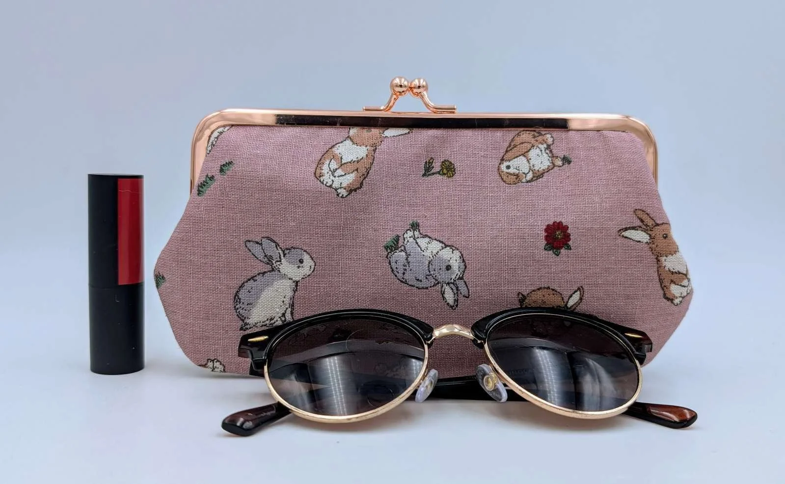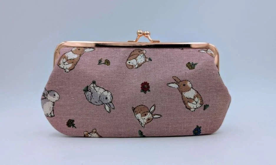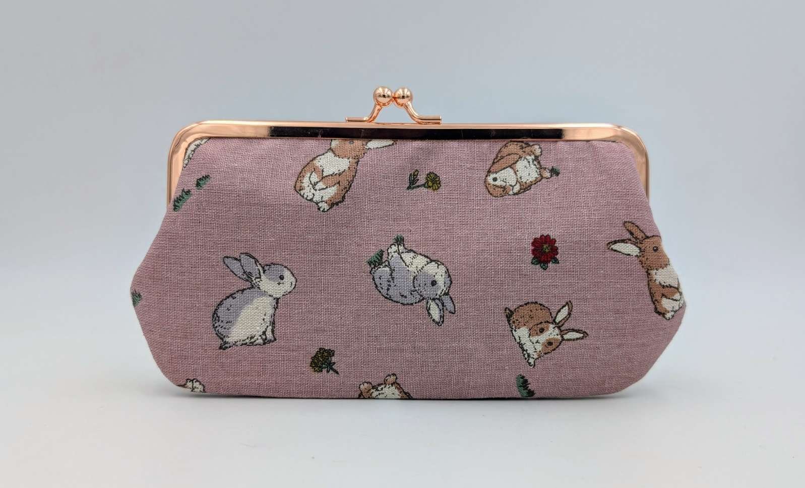 Handmade long purse from Japanese fabric featuring cute bunnies on a pink background