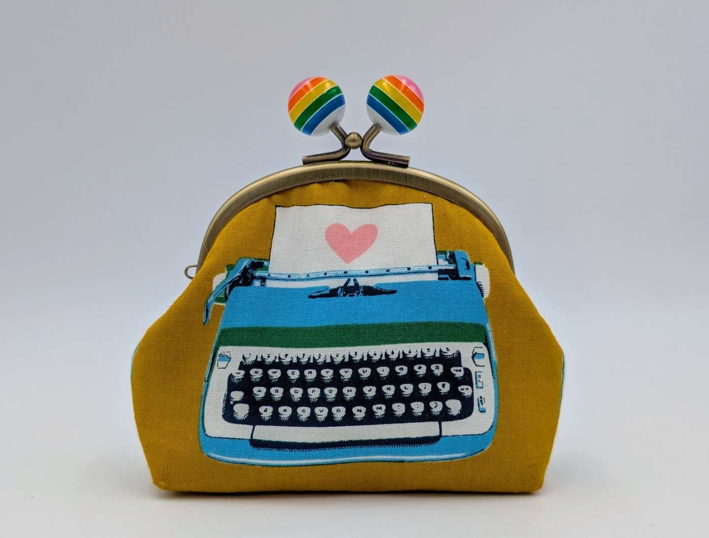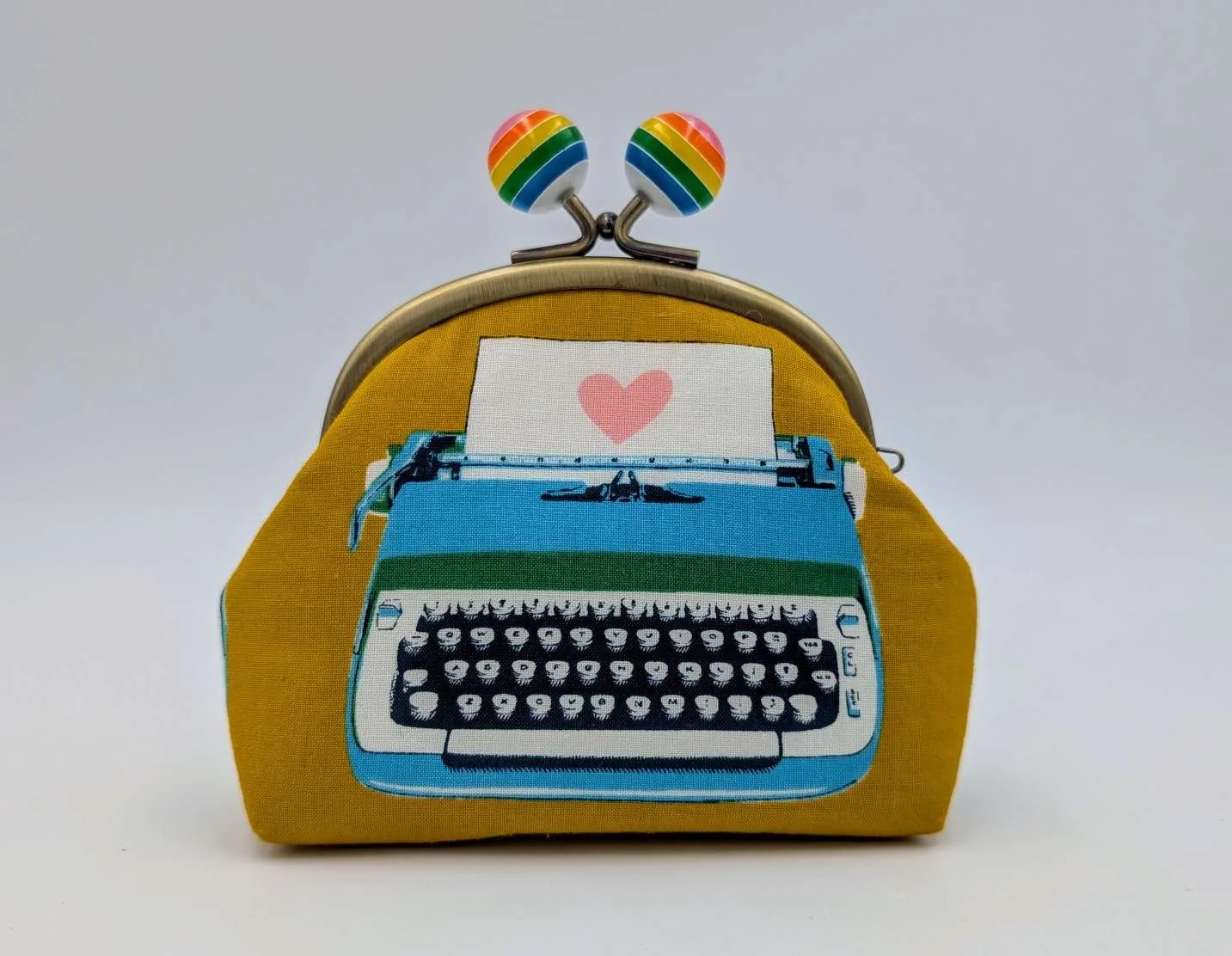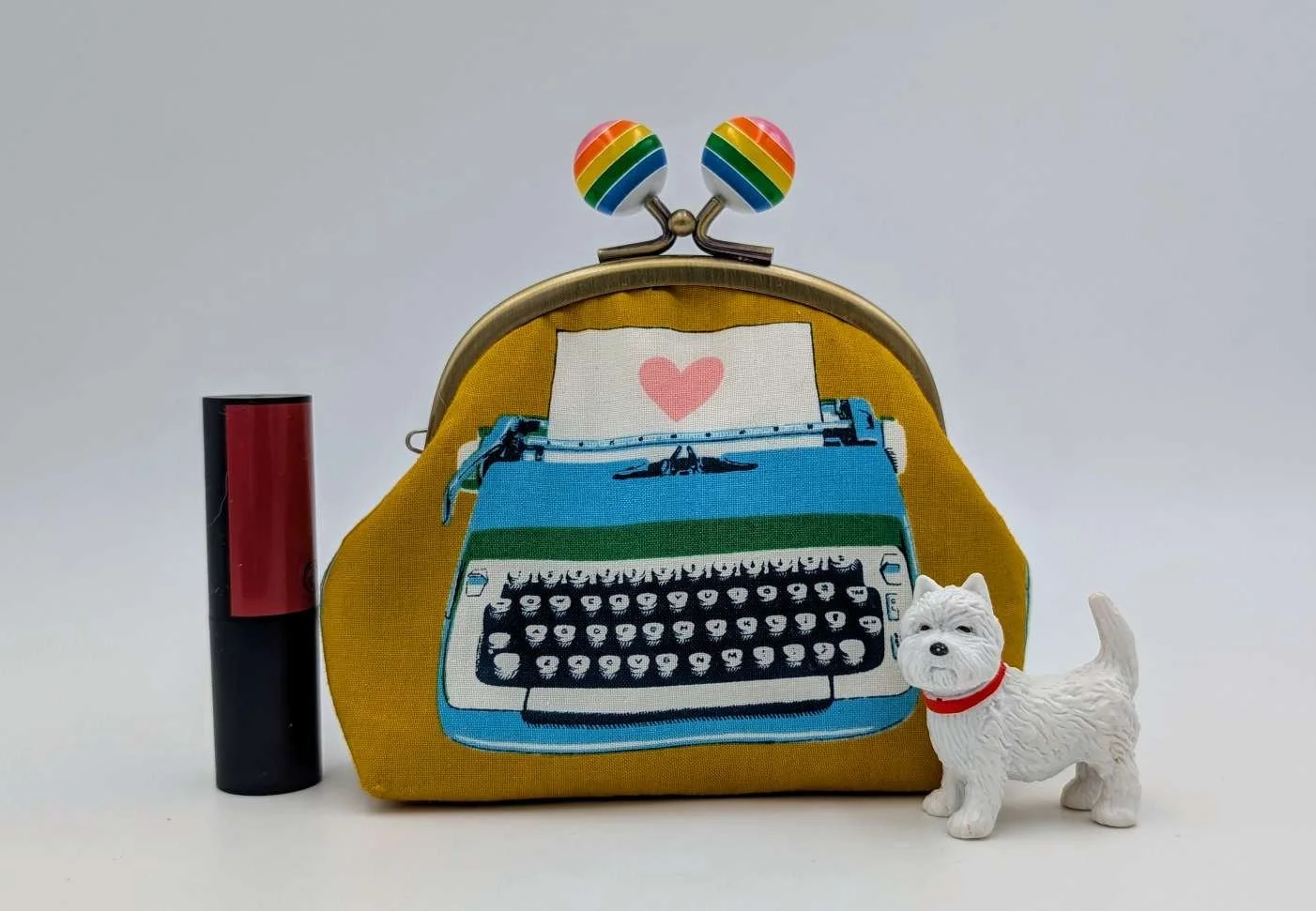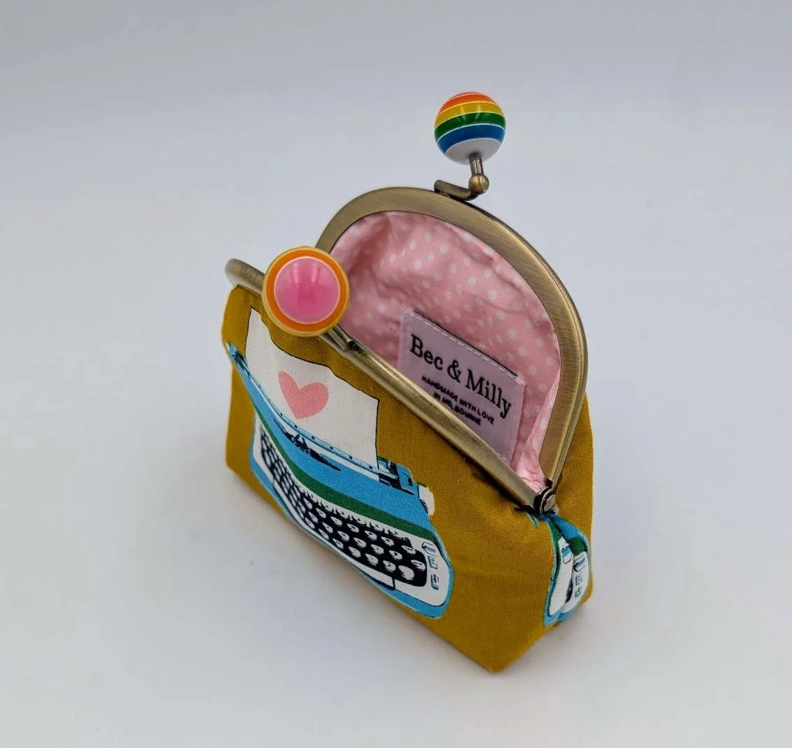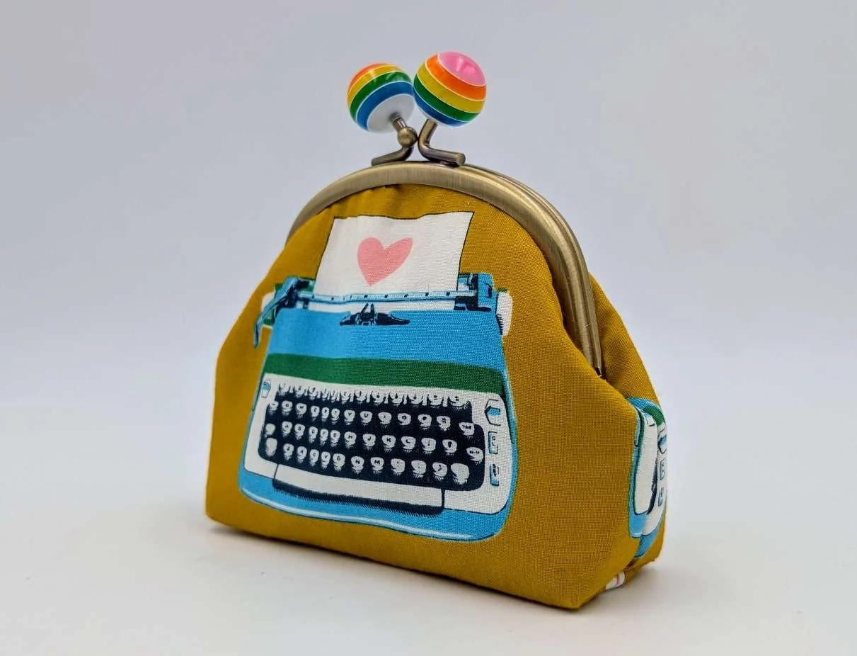 Handmade sweet little purse from cute vintage typewriter fabric on a mustard yellow background