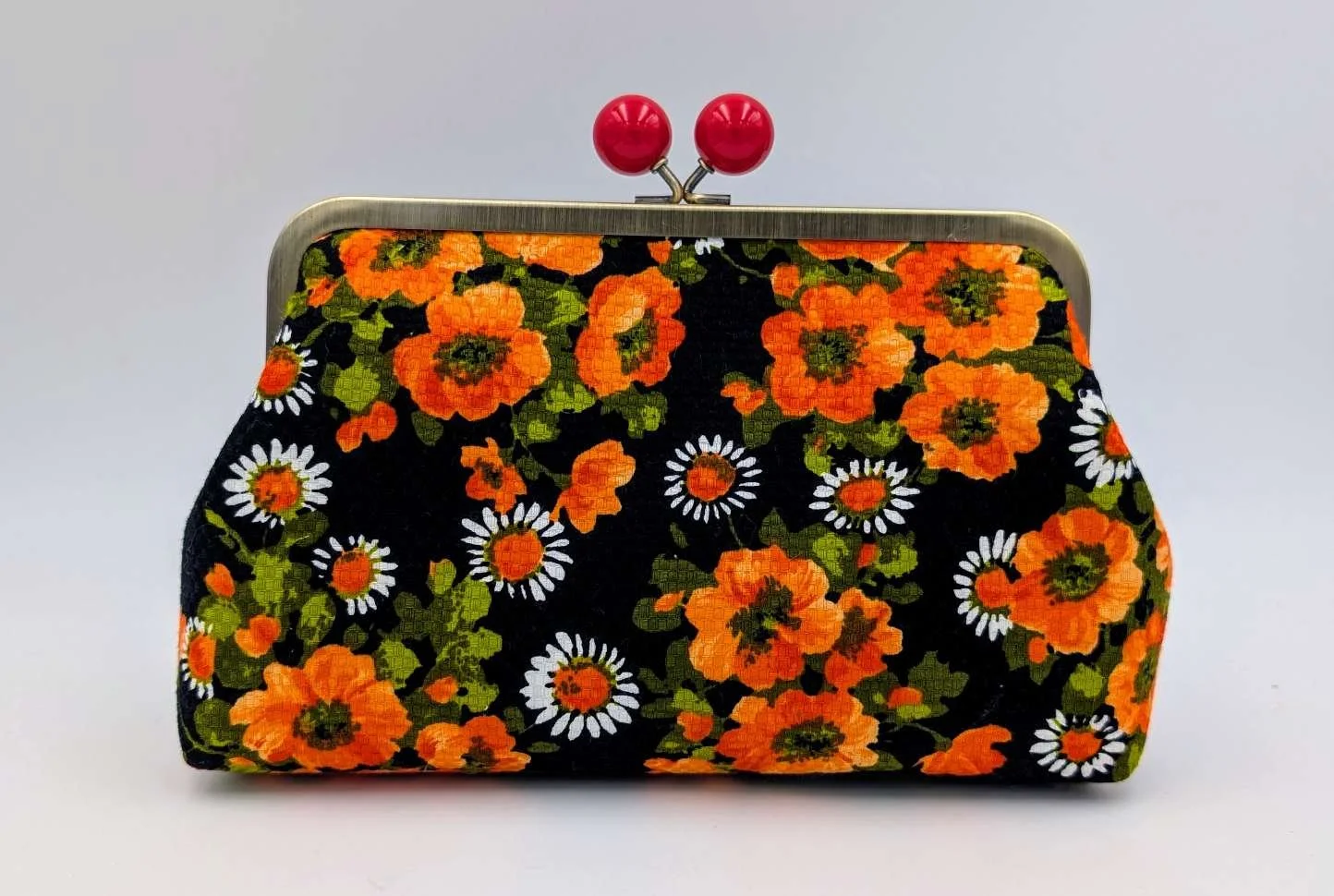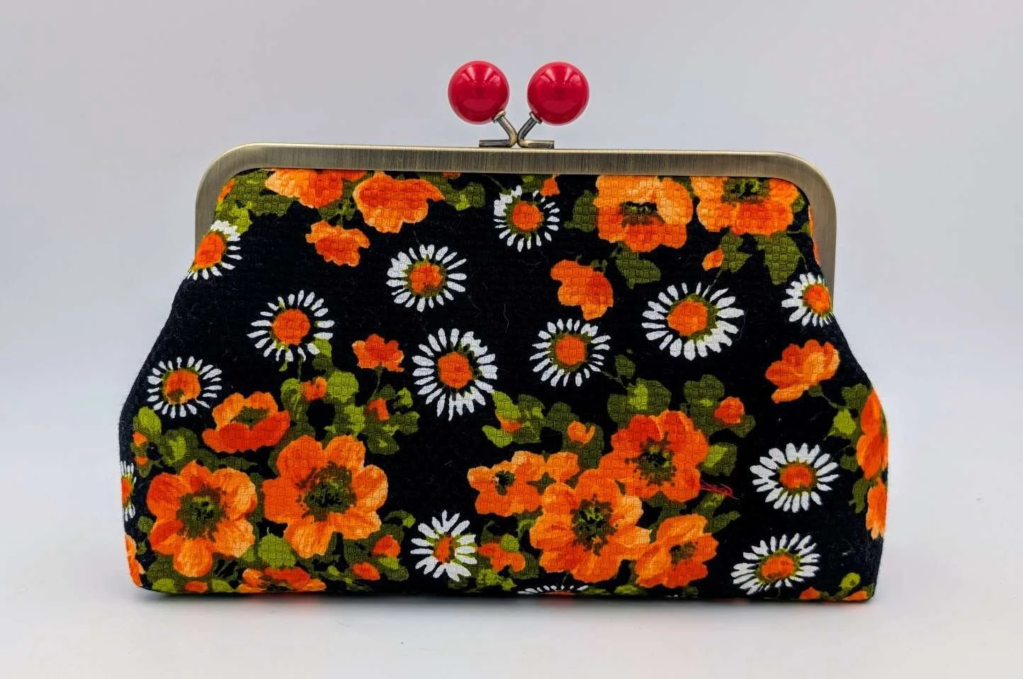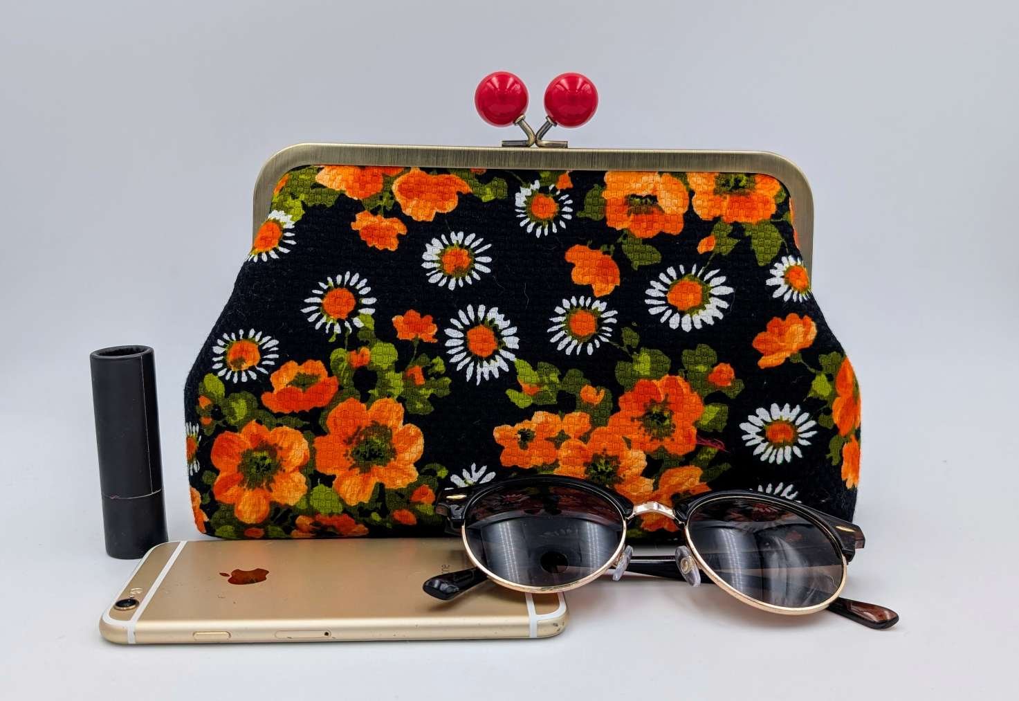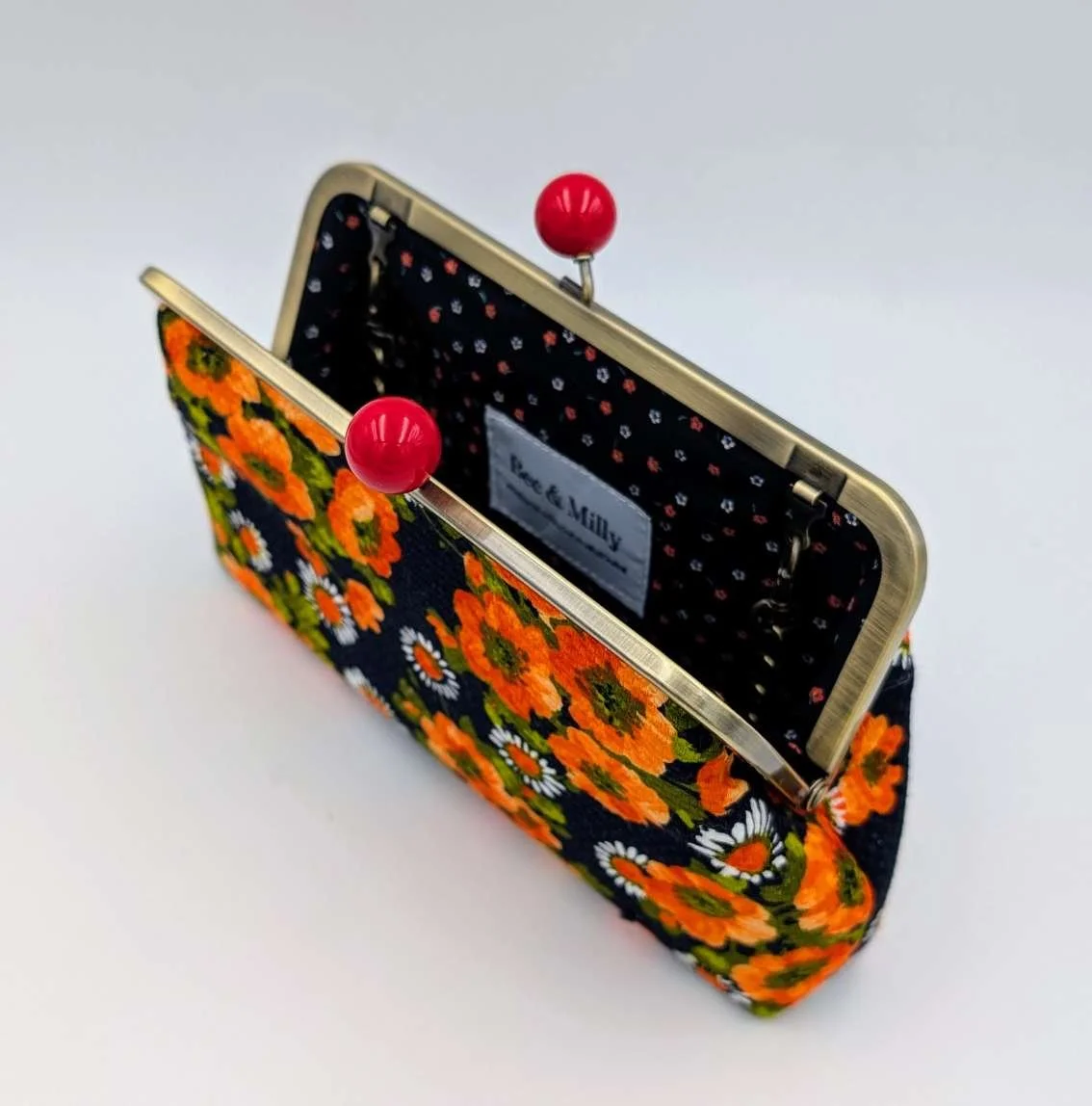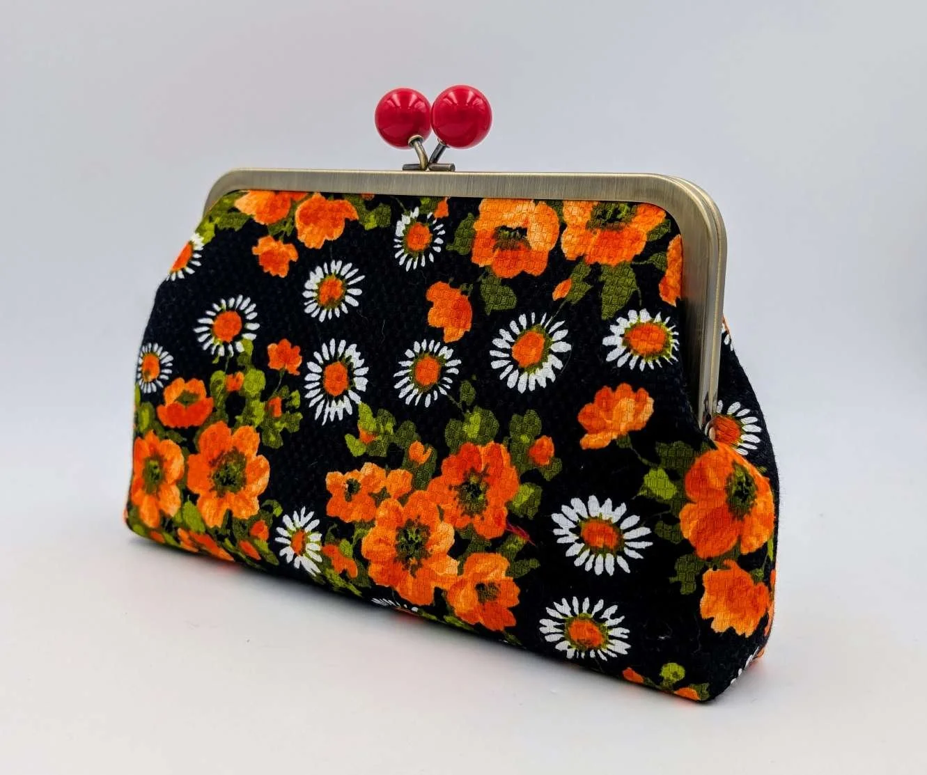 Handmade clutch from pretty vintage fabric featuring red and white flowers on a black background