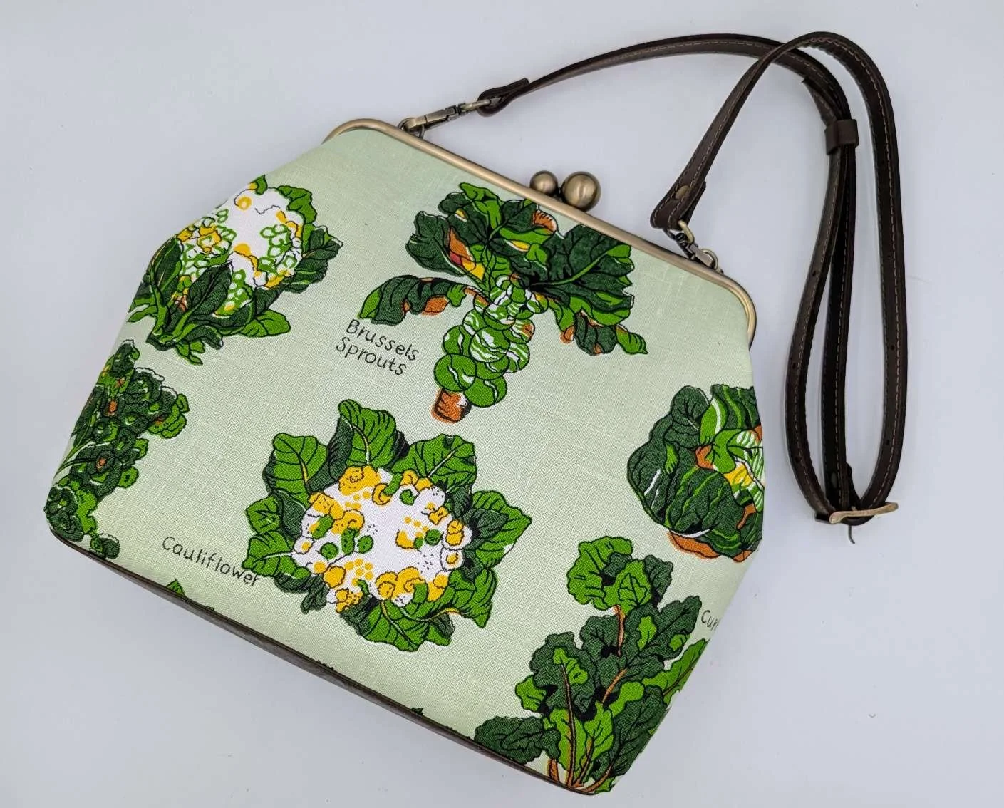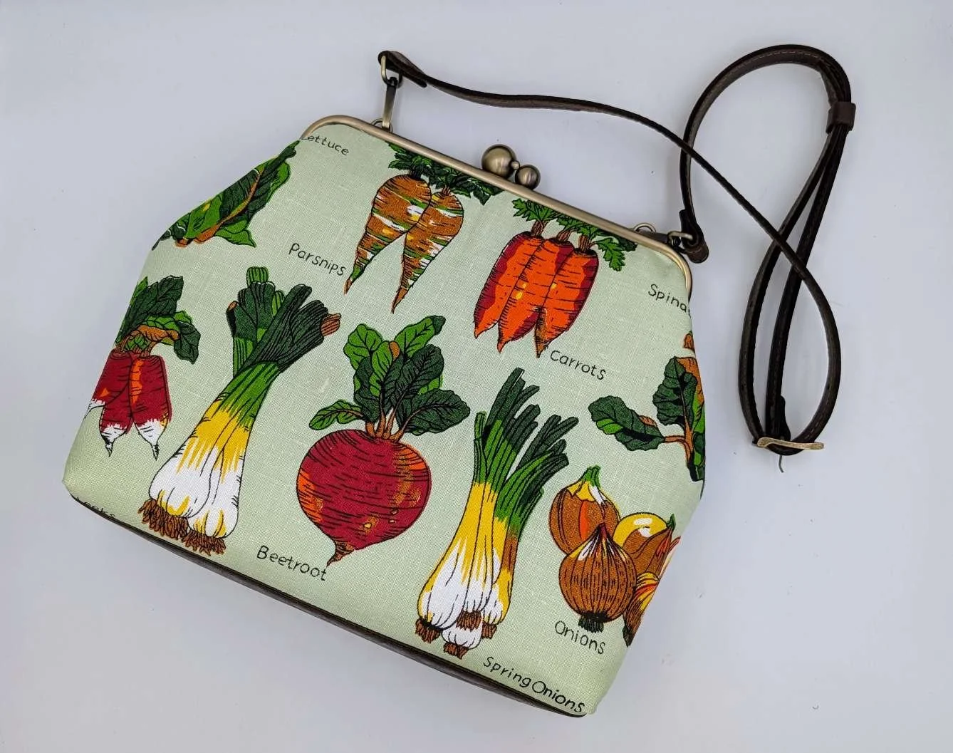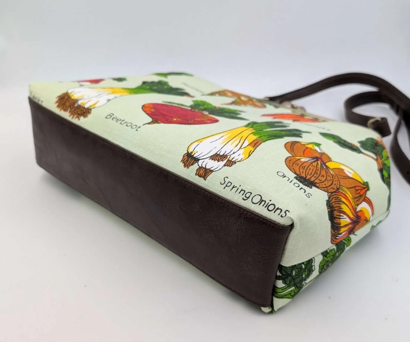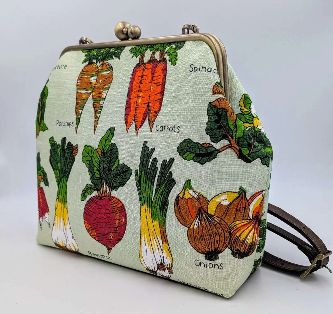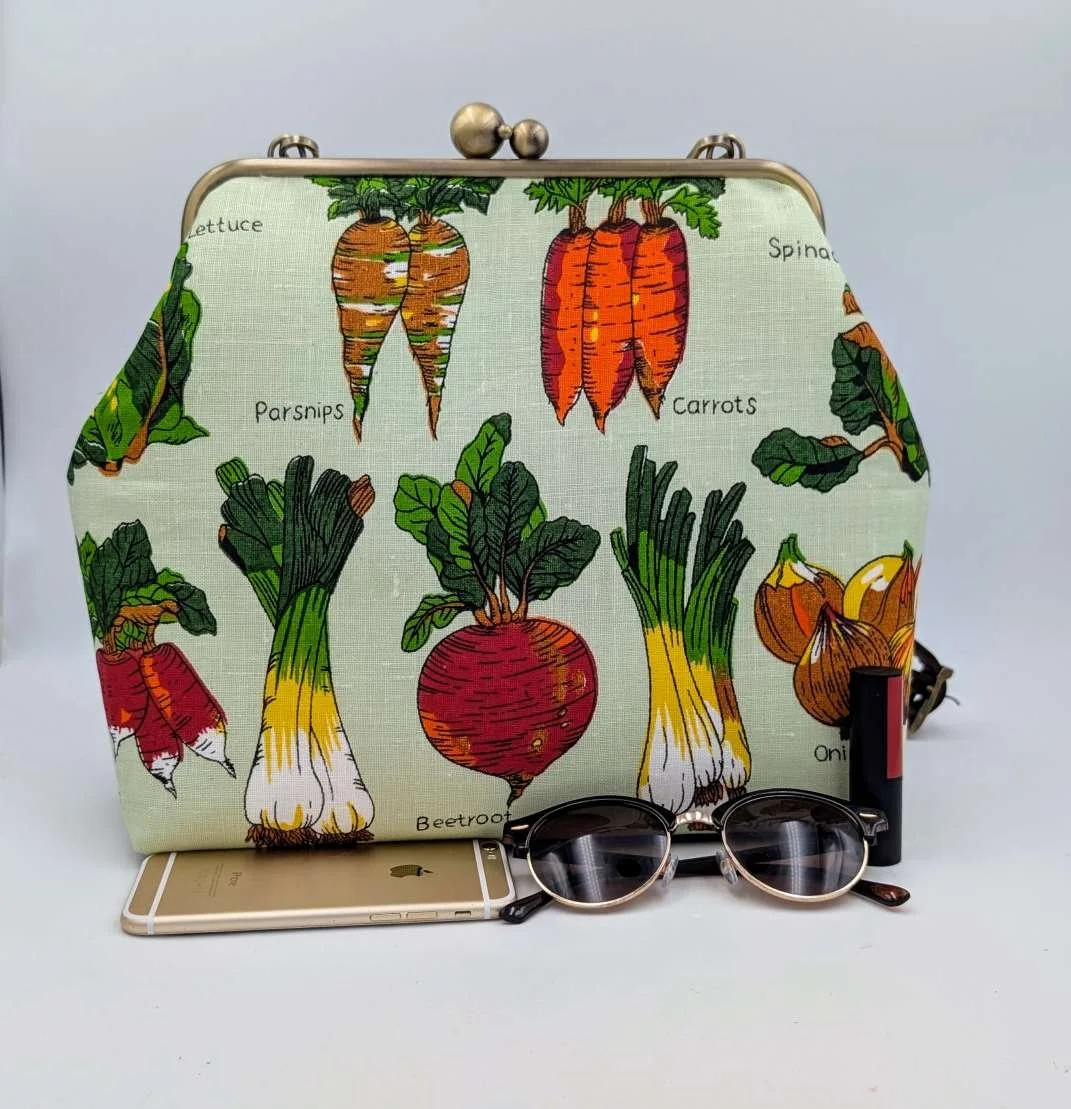 Handmade unique extra large handbag from vintage linen featuring garden vegetables on a mint green background