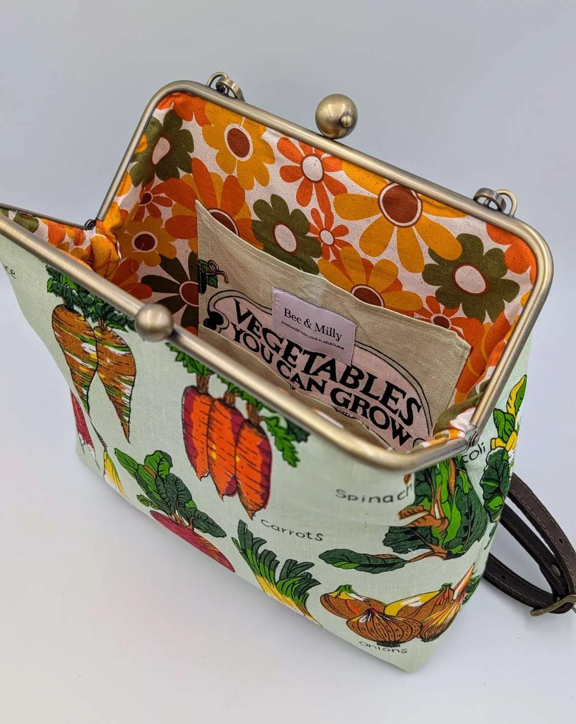 Lined with retro flower patterned cotton fabric and has a matching inside pocket