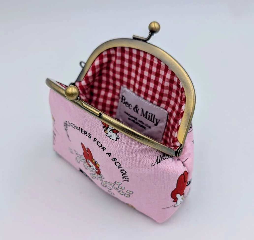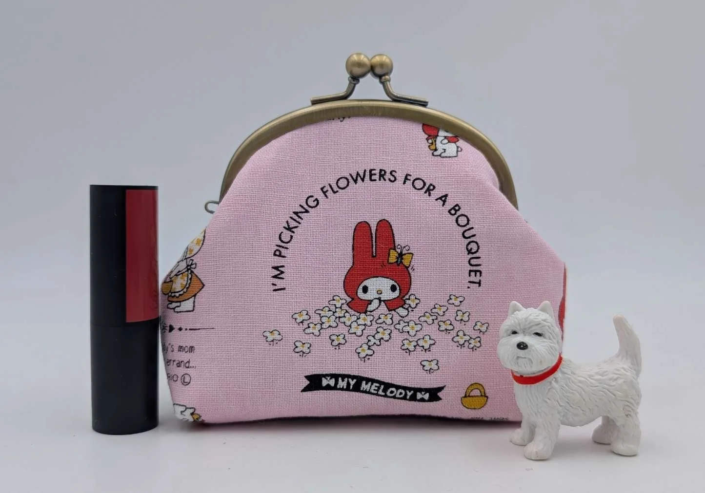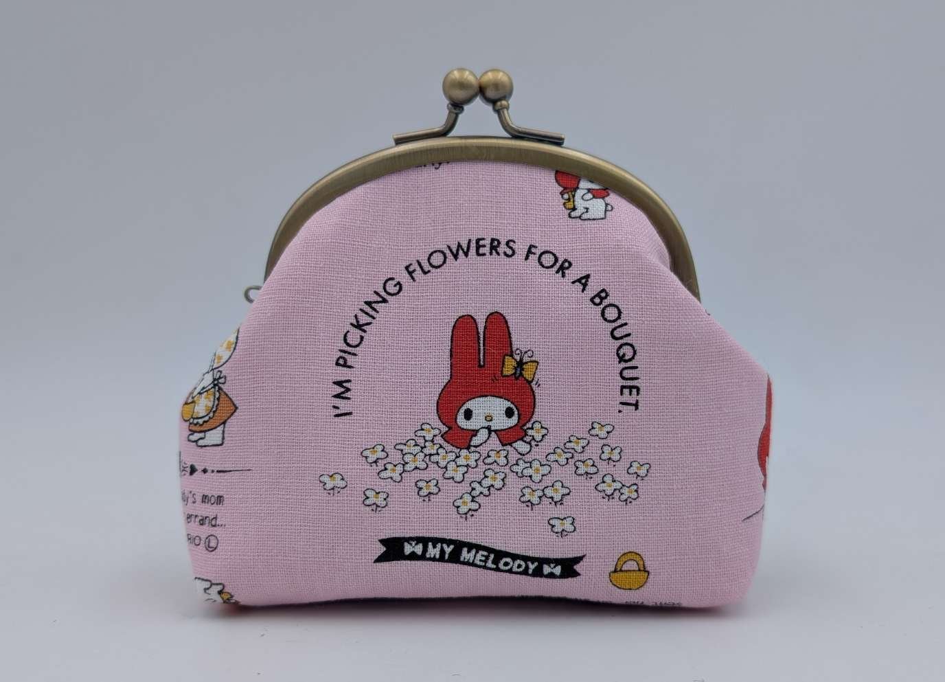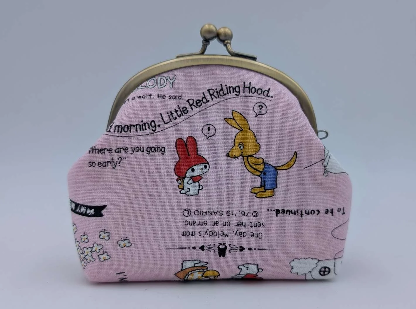 Handmade sweet little purse from Japanese fabric featuring My Melody bunny dressed as little red riding hood on a pink background