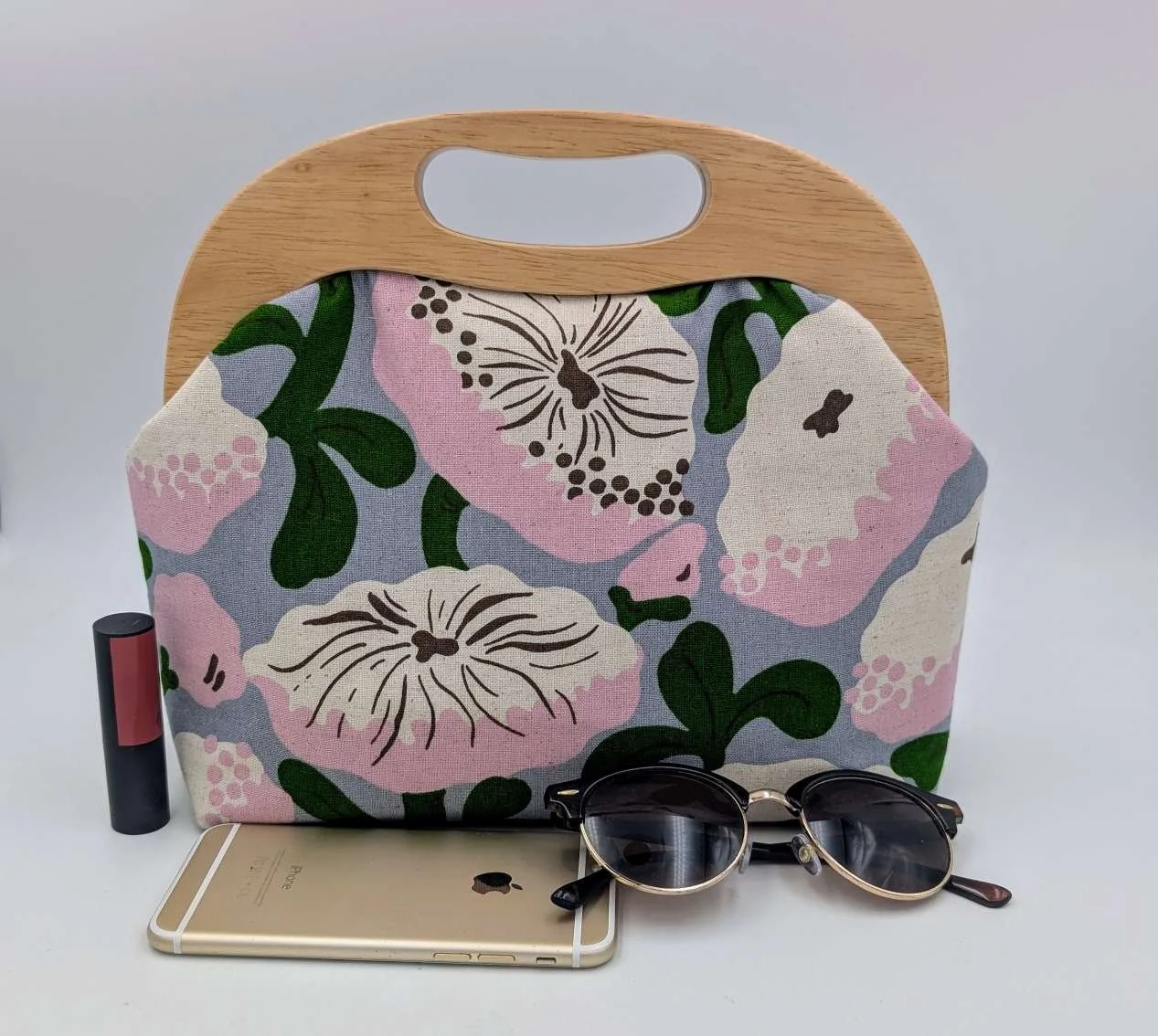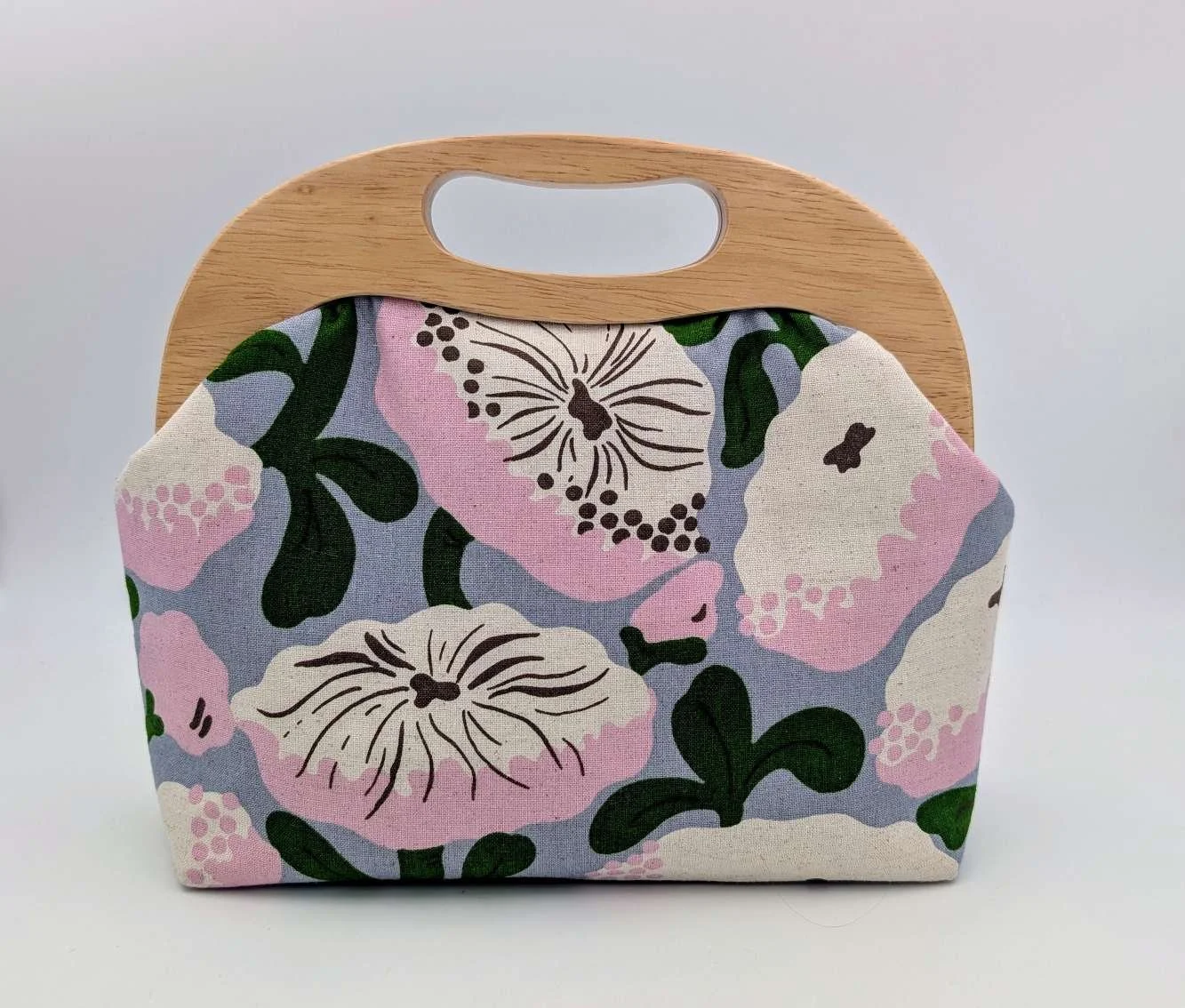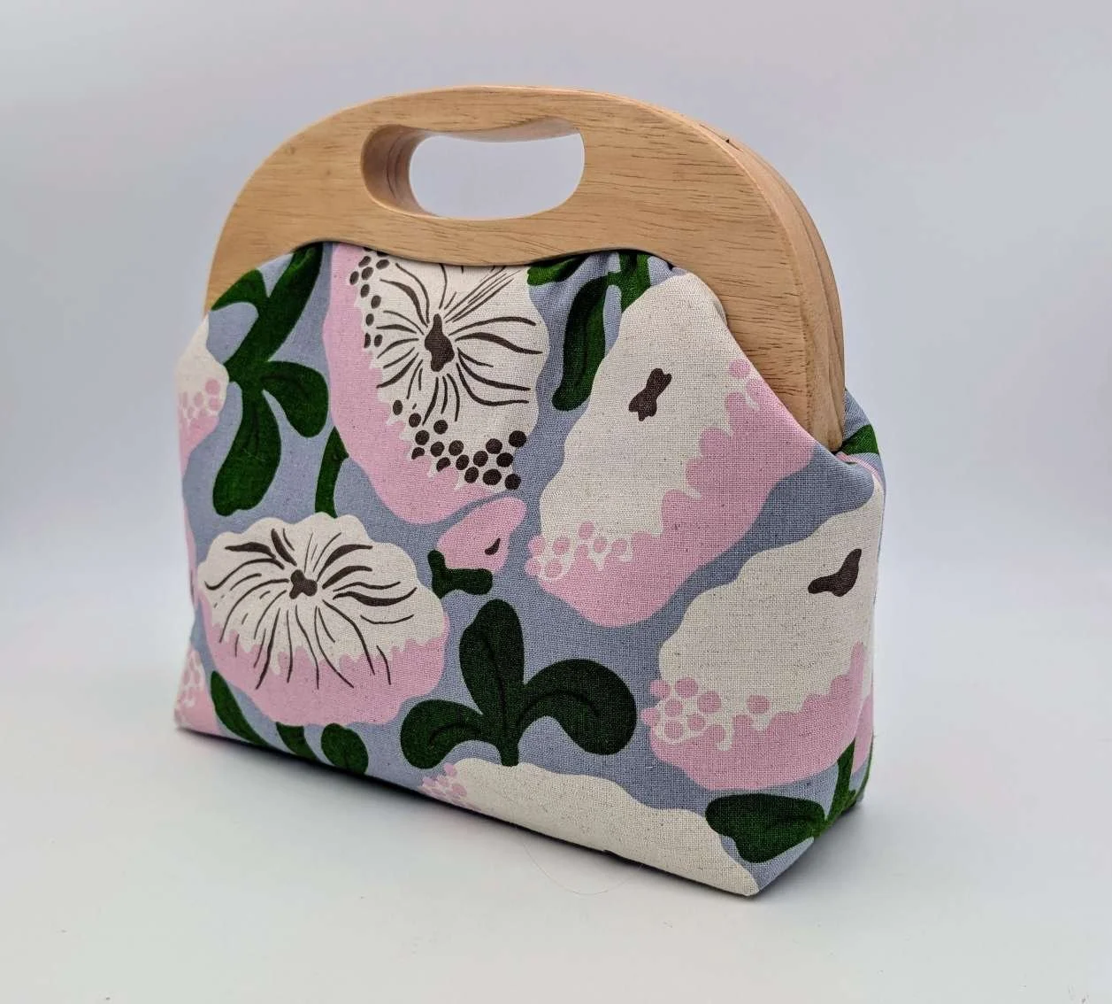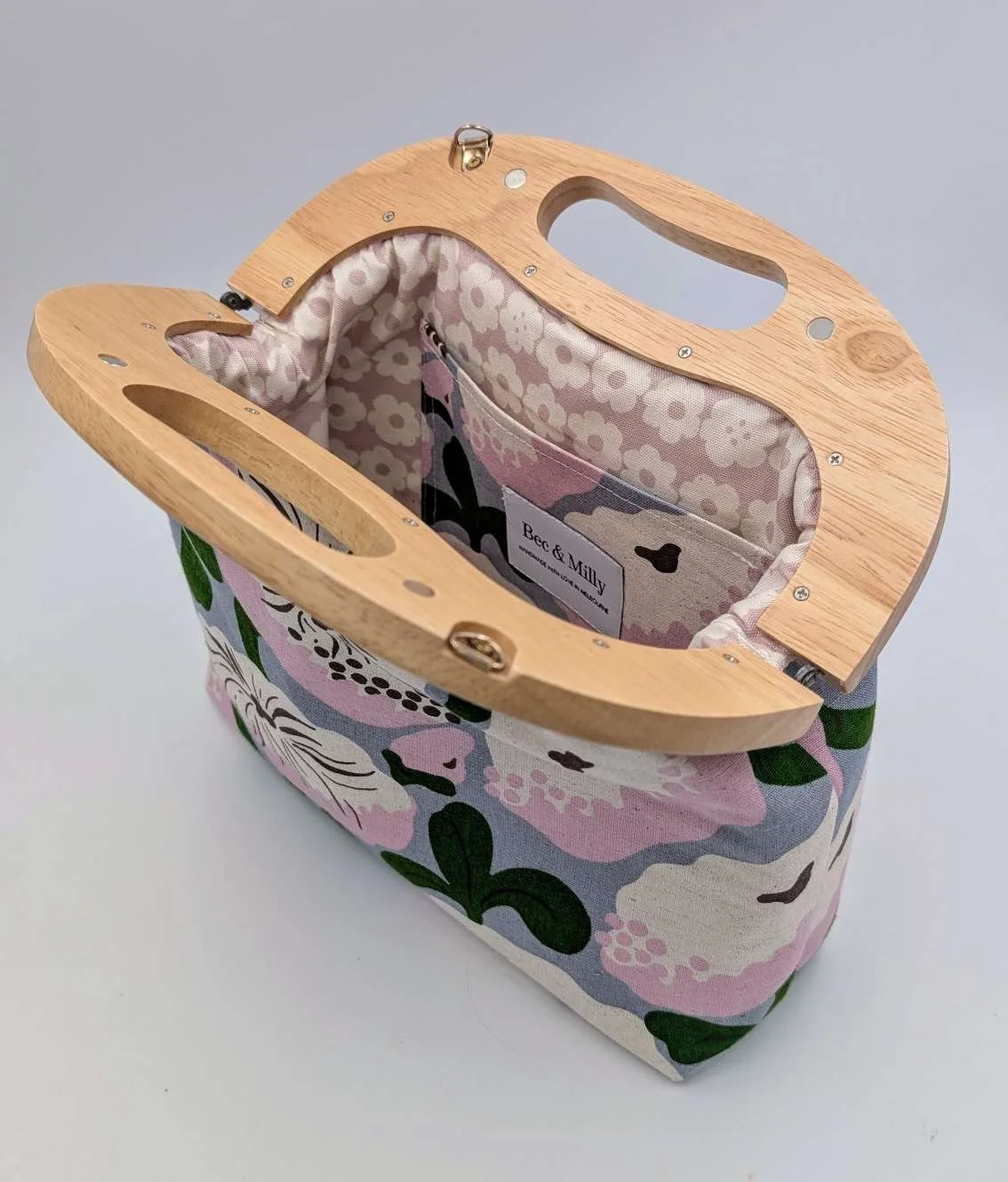 Handmade handbag from Japanese canvas fabric featuring large pink and white flowers on a grey/mauve background