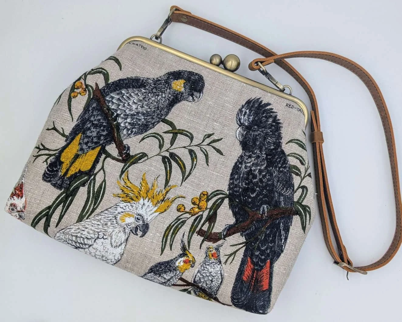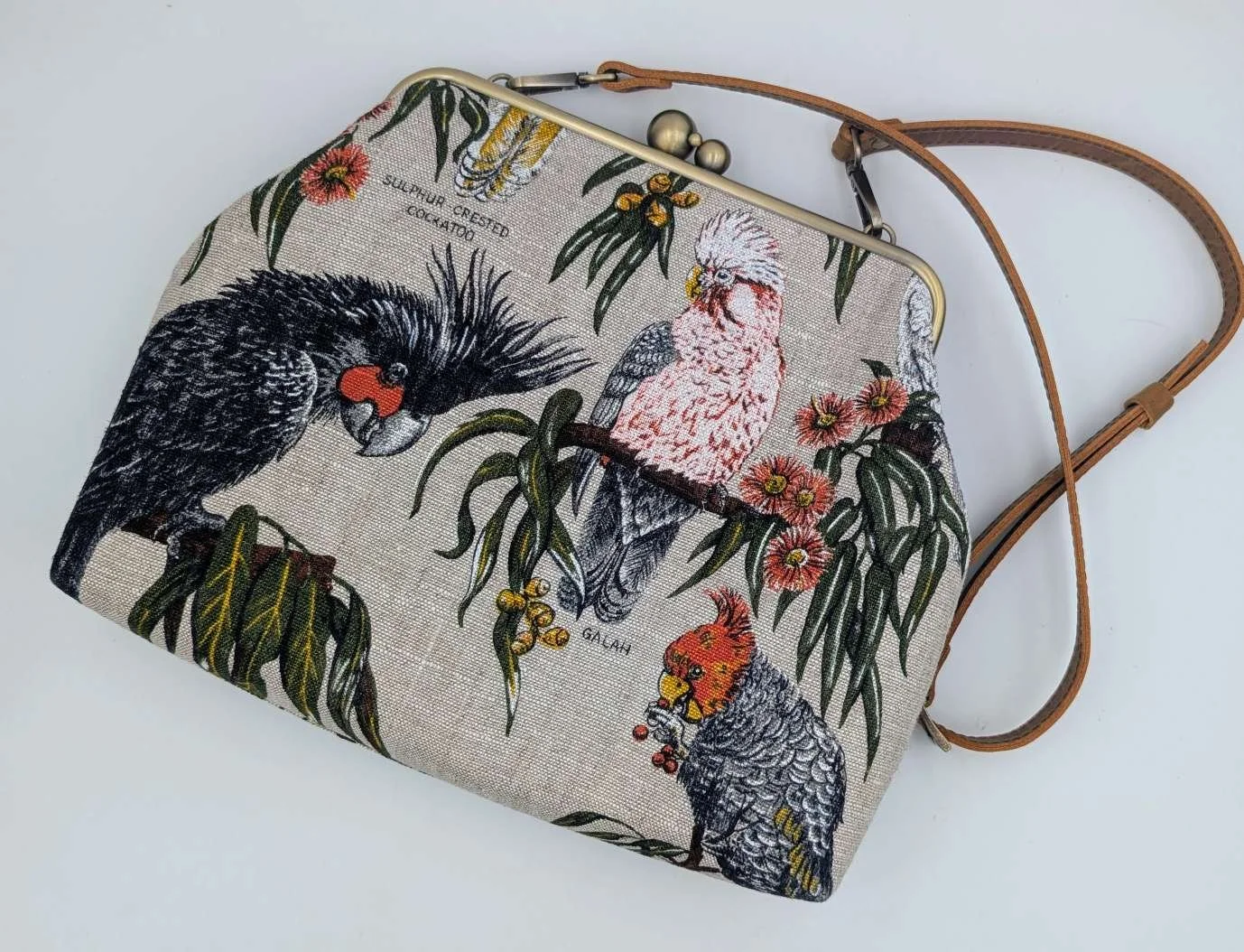 Handmade extra large handbag from vintage linen featuring Australian cockatoos