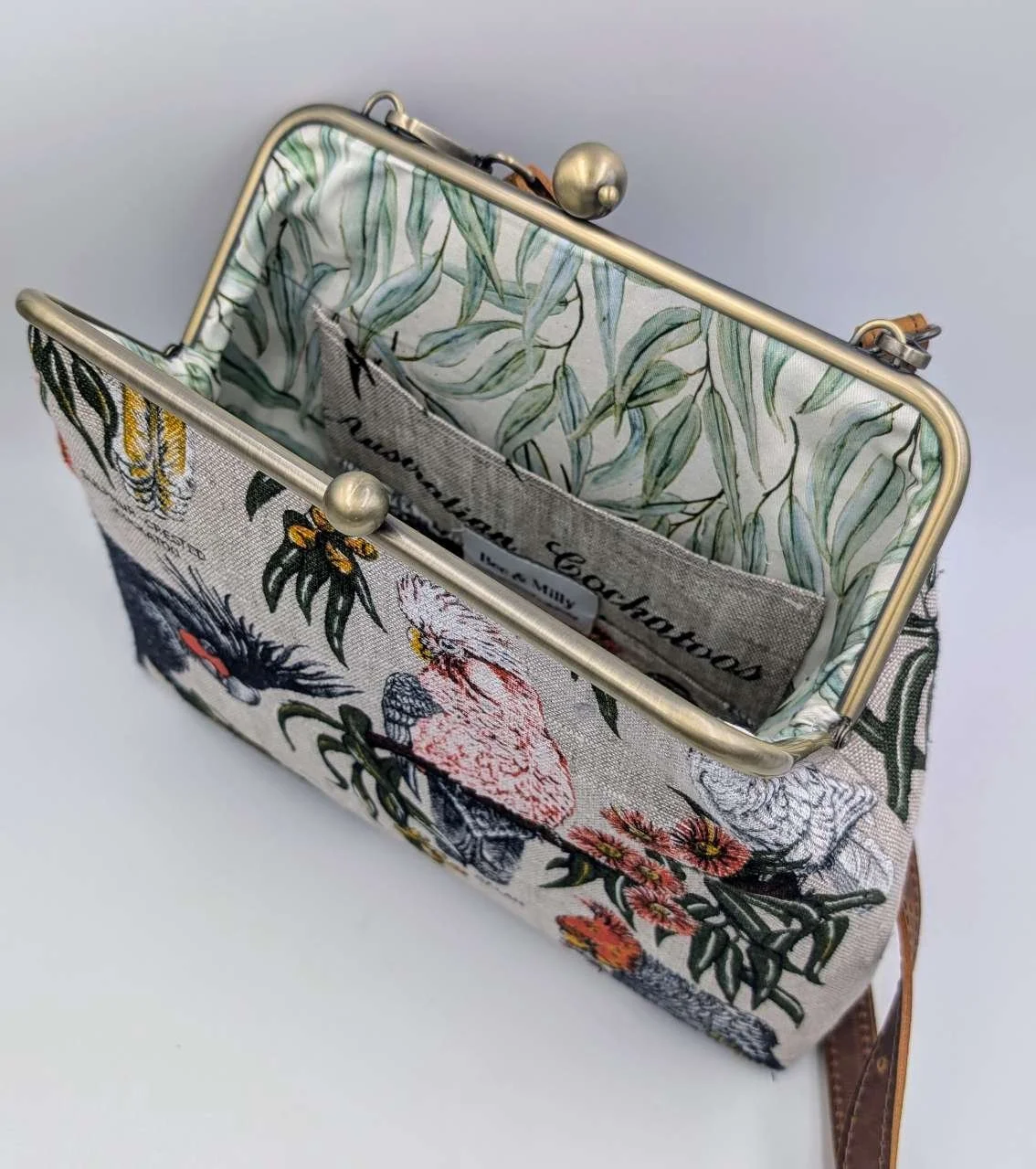 Lined with gumleaf patterned cotton fabric and has a matching inside pocket