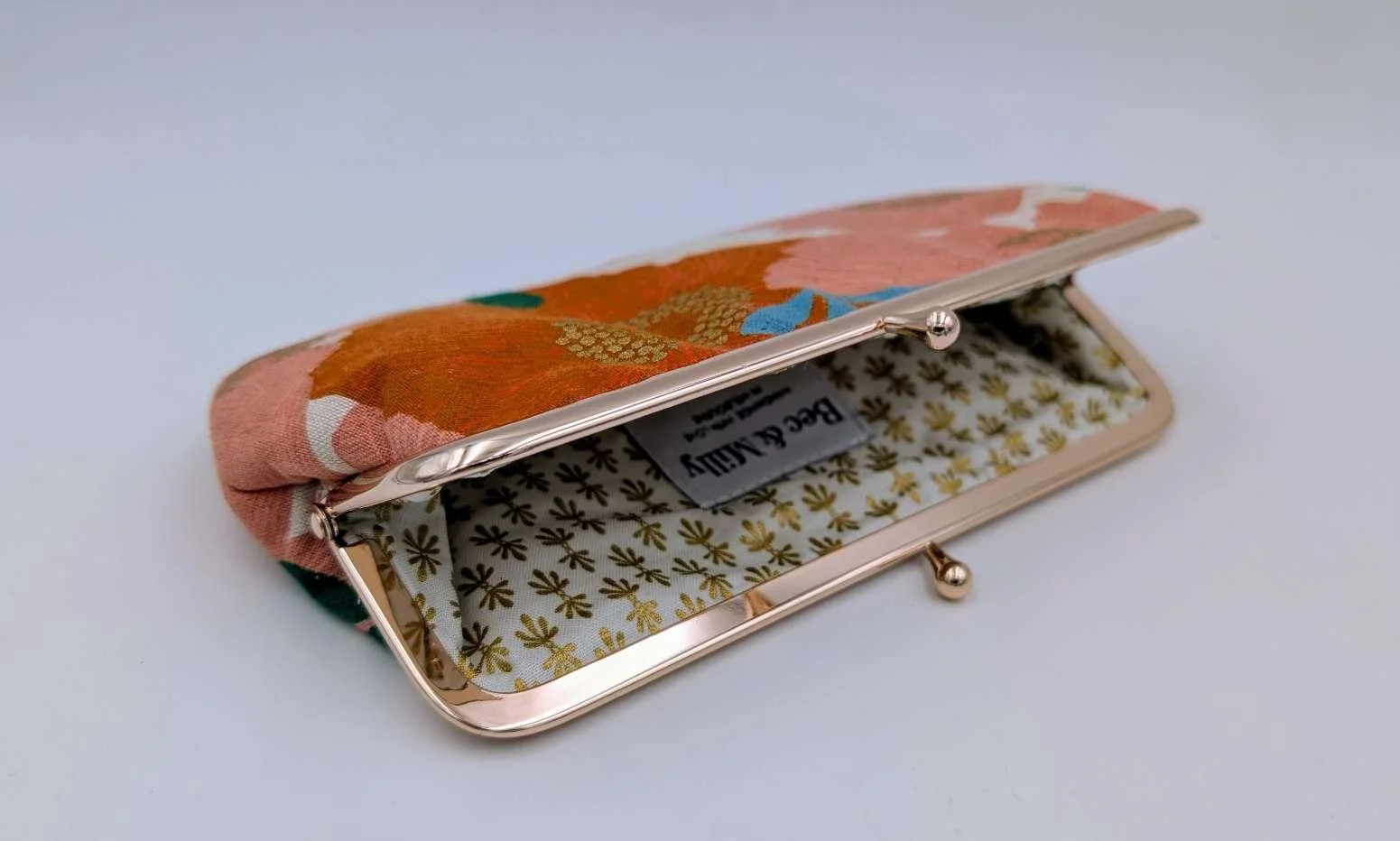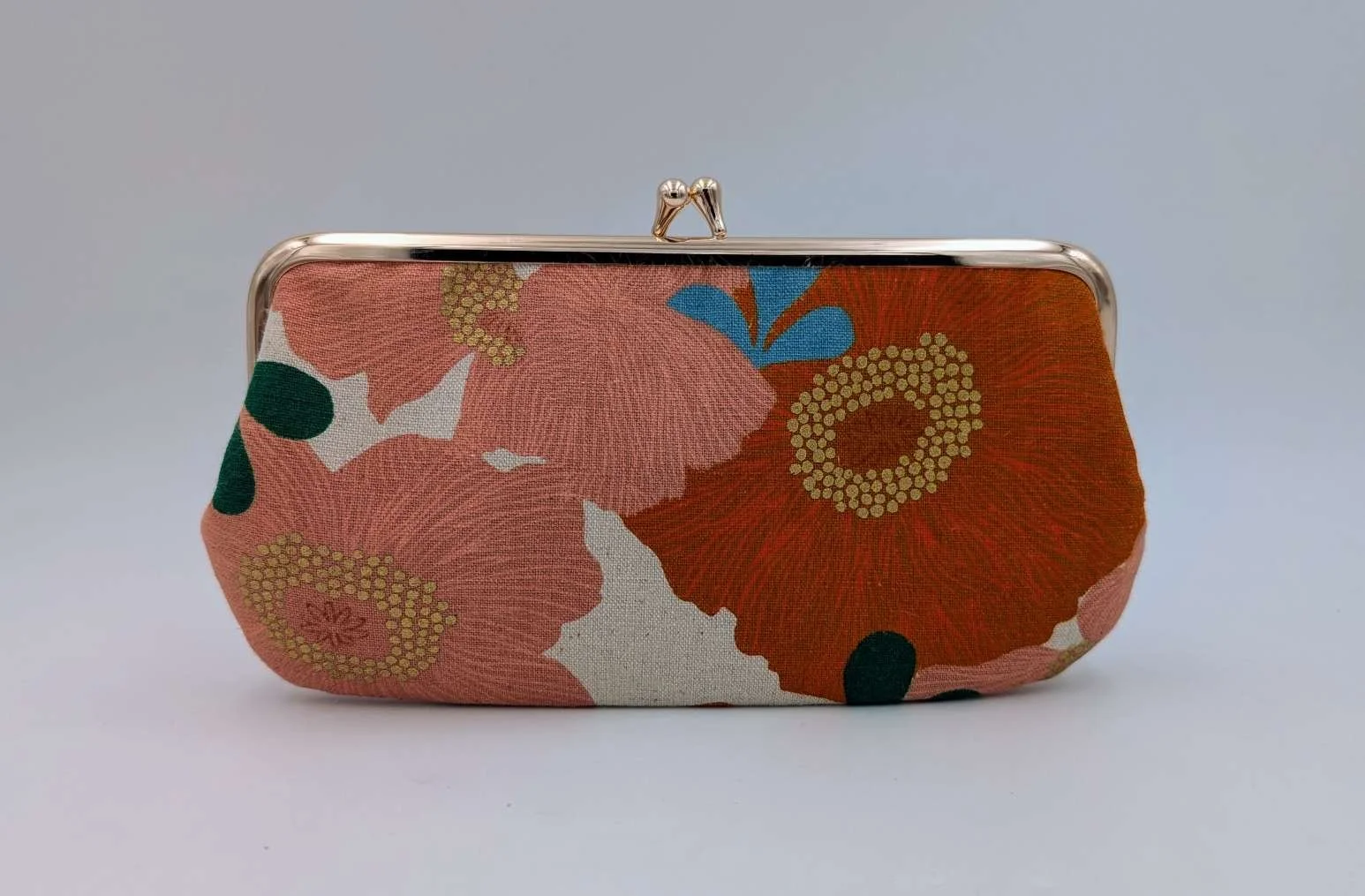 Handmade long purse from apricot camilla canvas fabric with gold embellishments