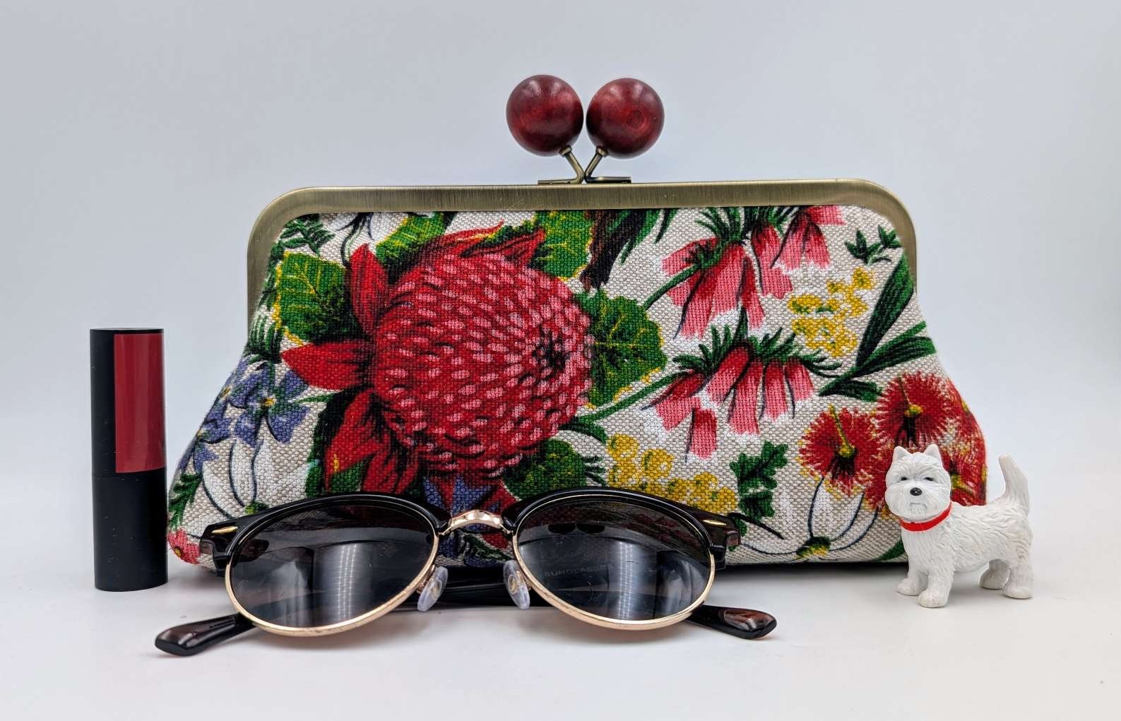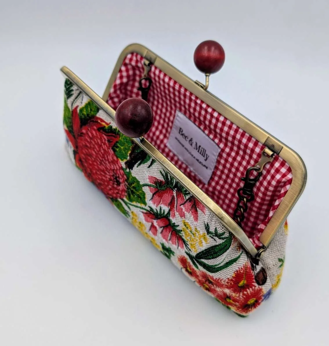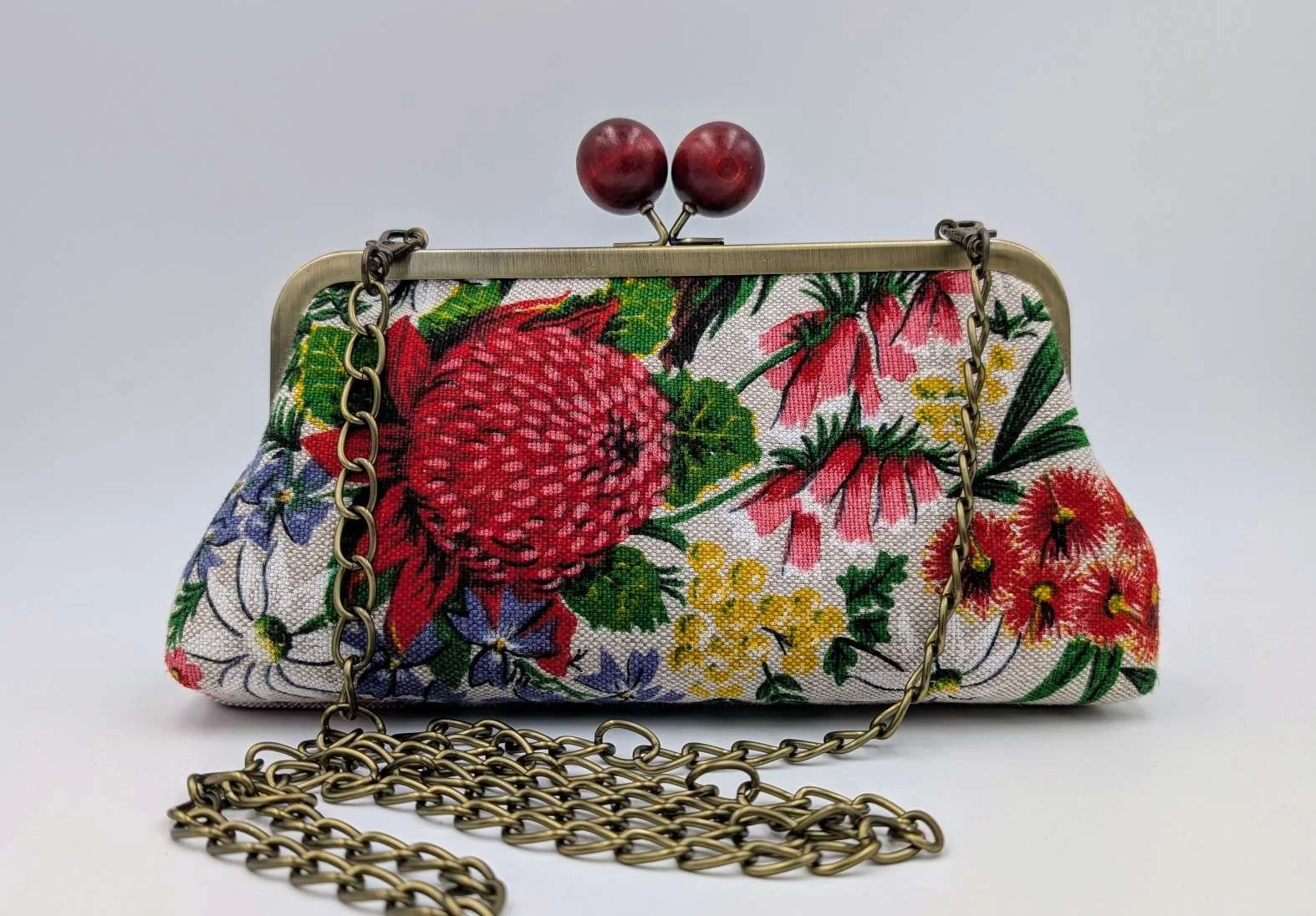 Finished with a kisslock frame with wooden maroon bobbles, and has a shoulder chain so can be a clutch or handbag