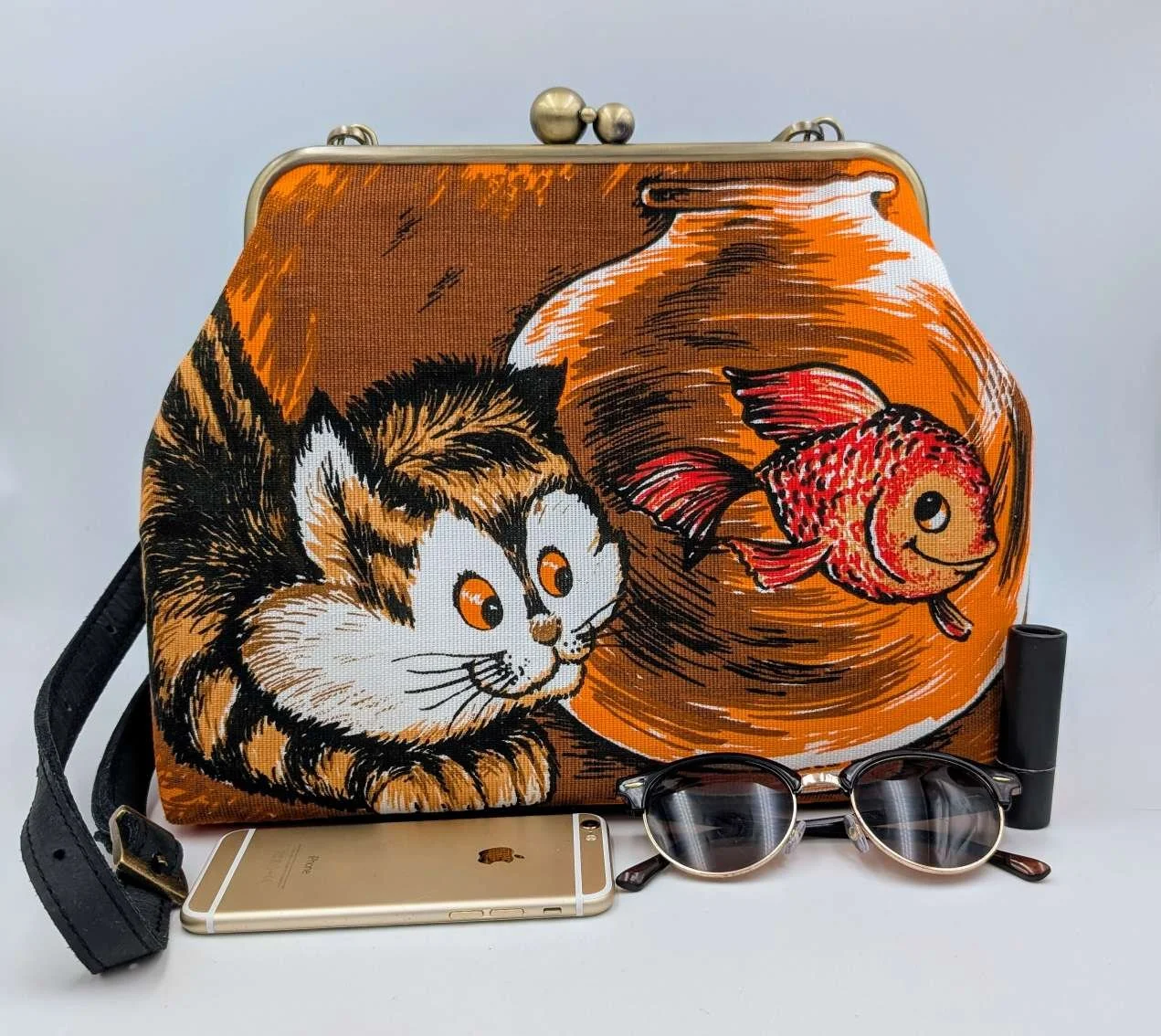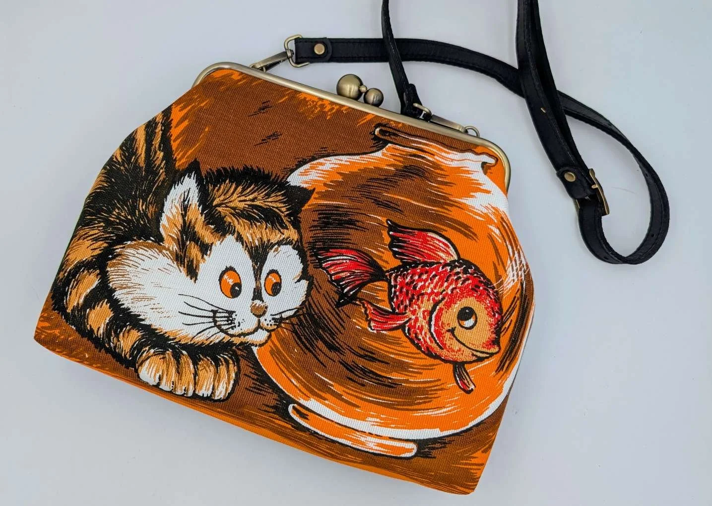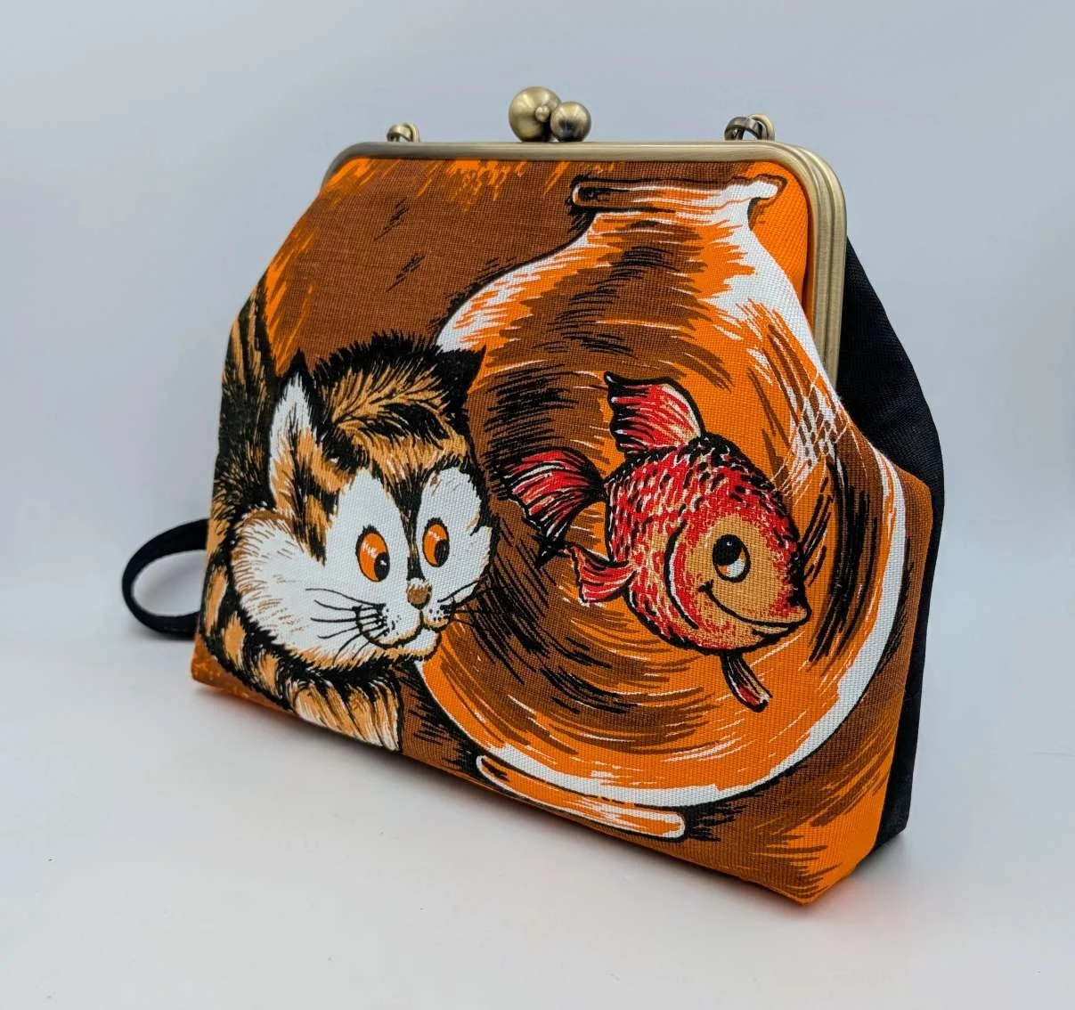 Handmade unique extra large handbag from super cute vintage cat and goldfish linen fabric, and has a black upholstery fabric back panel