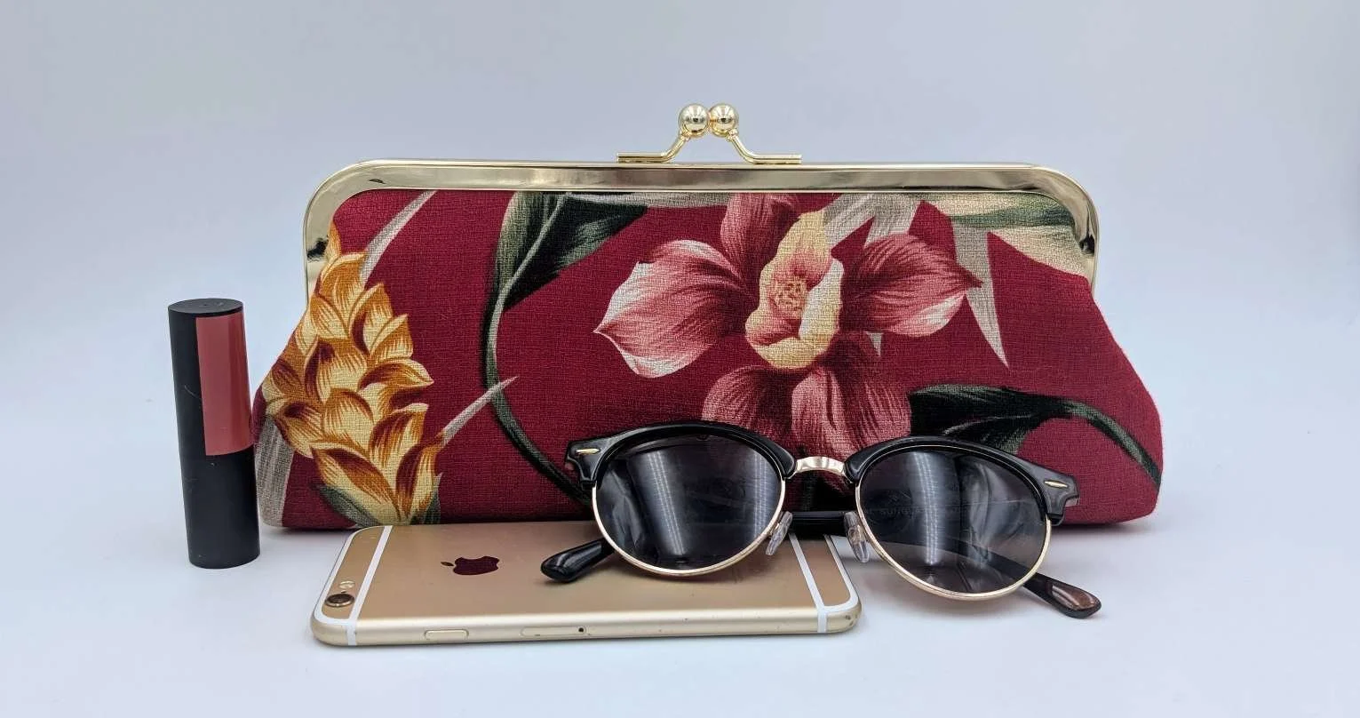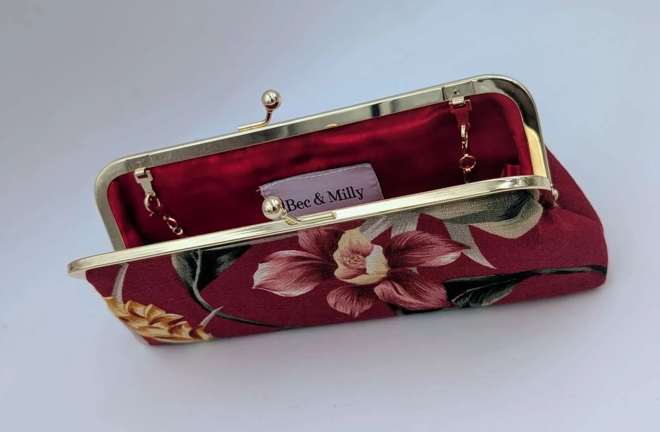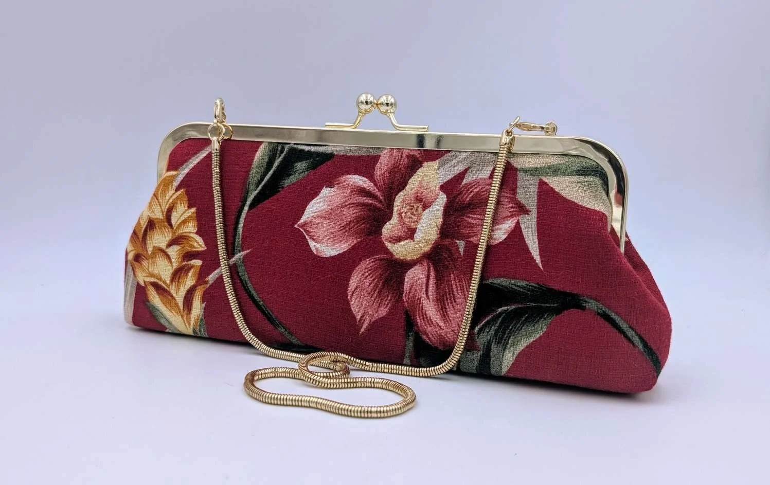 Handmade unique elegant clutch purse from lovely vintage 1950’s maroon tropical barkcloth fabric