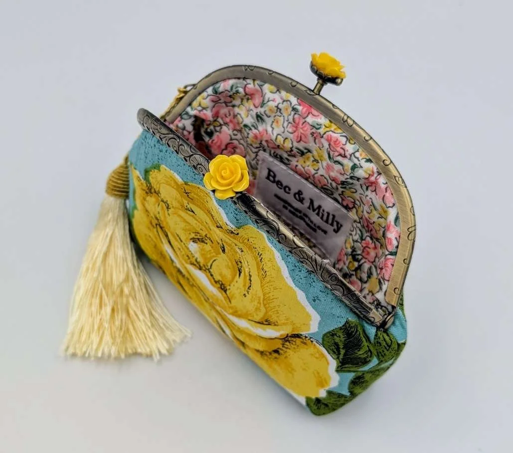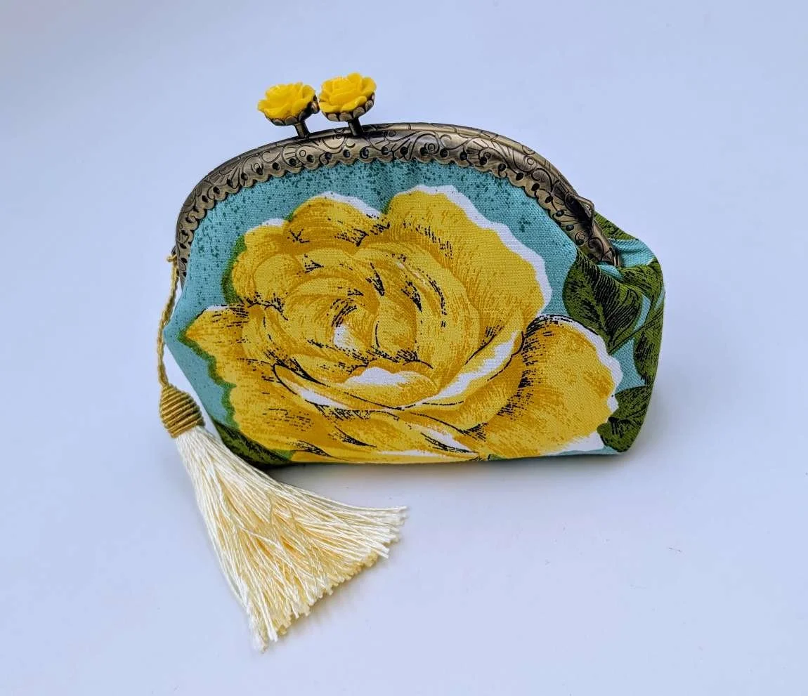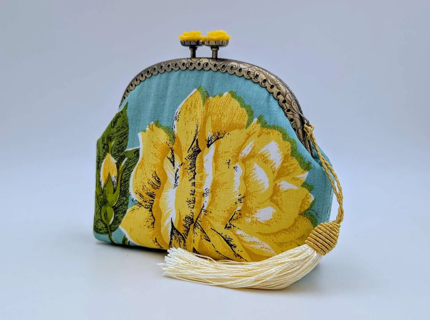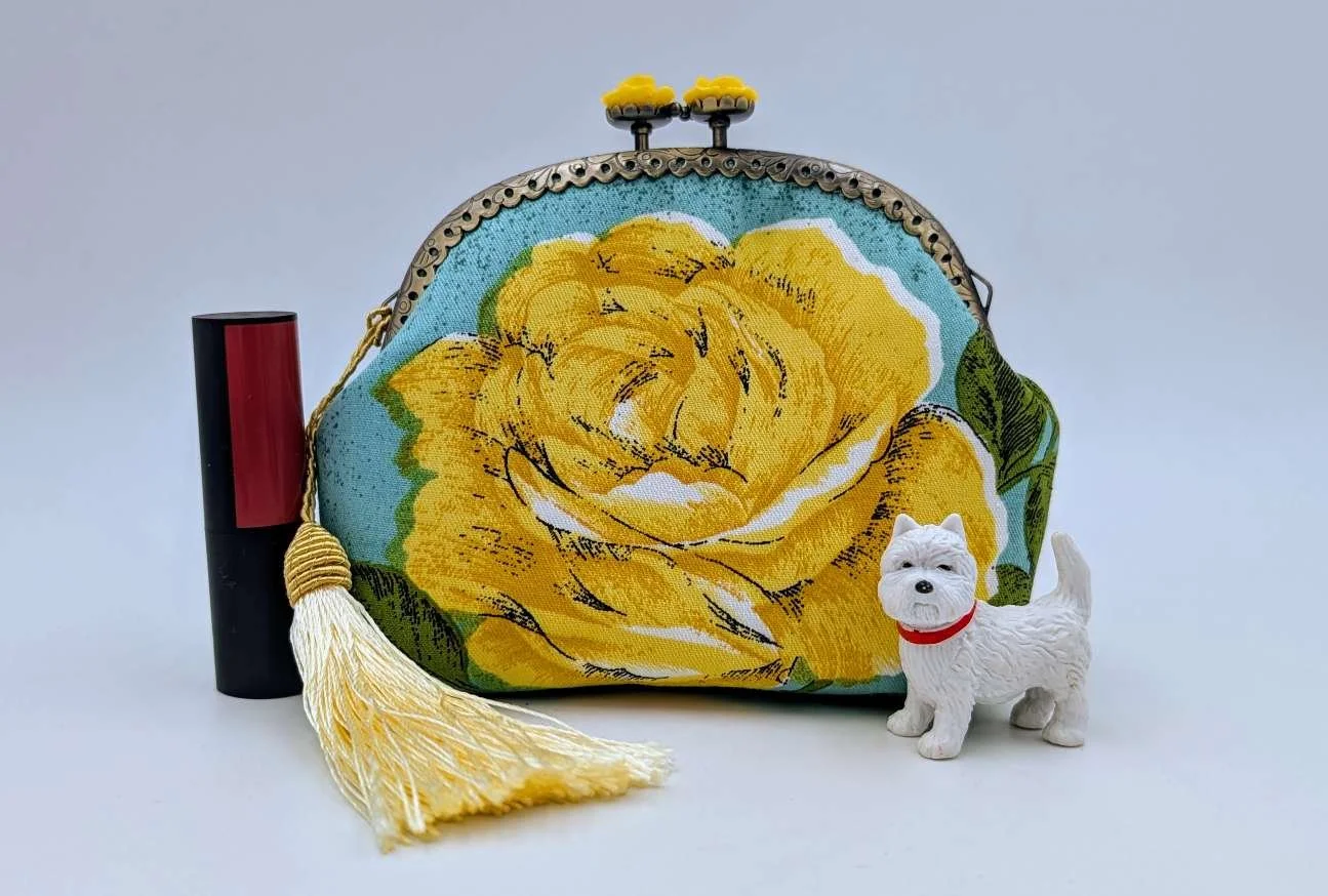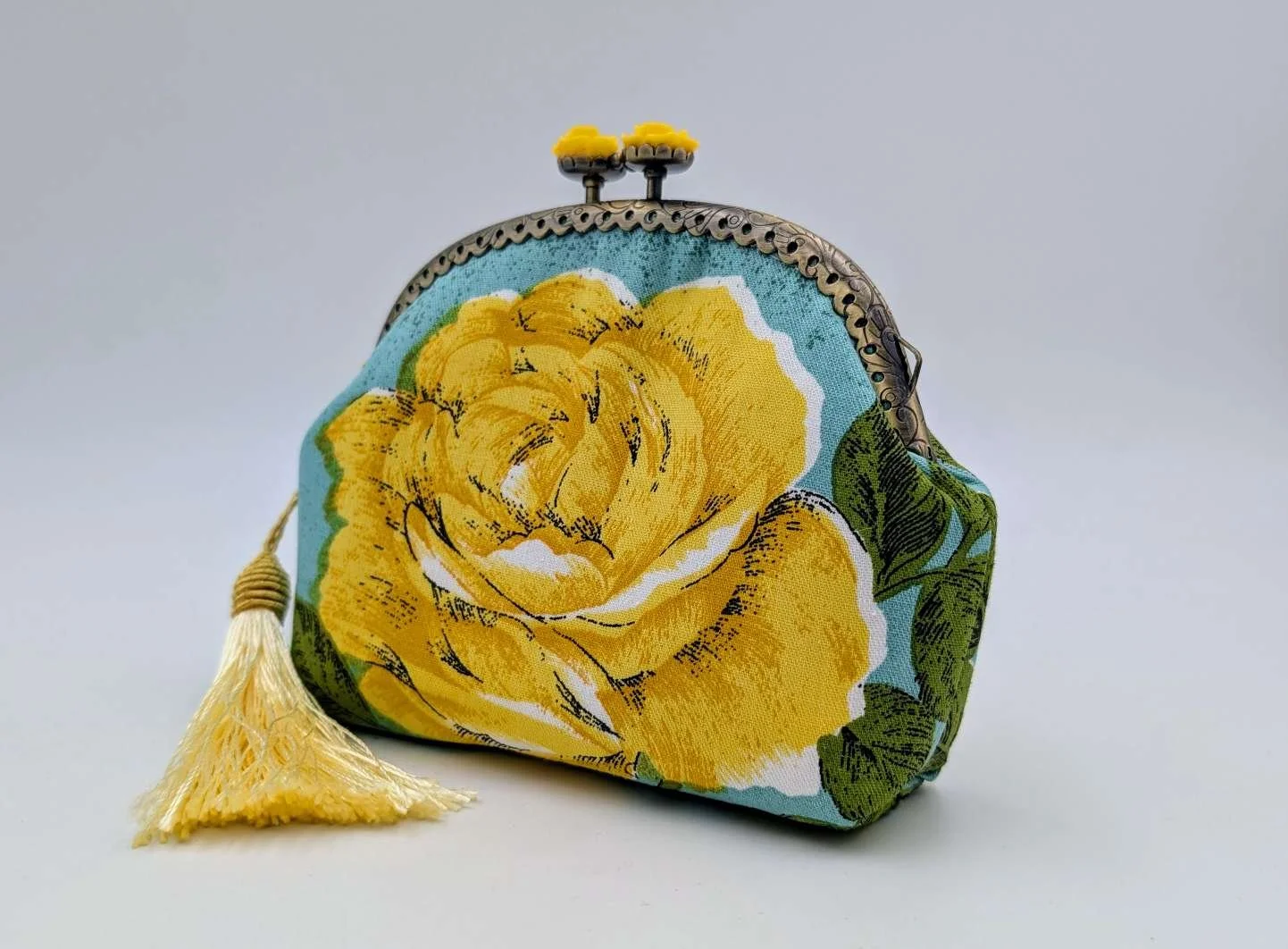 Finished with a kisslock frame with yellow rose shaped bobbles and a cream tassel